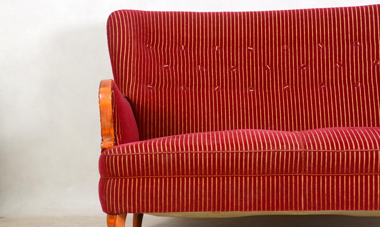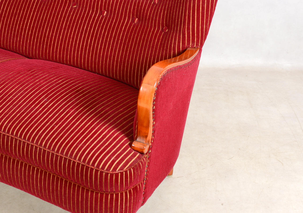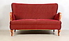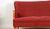 Röd plyschklädsel. Längd 140 cm. Djup 85 cm. Rygghöjd 85 cm. Sitthöjd 45 cm.