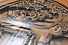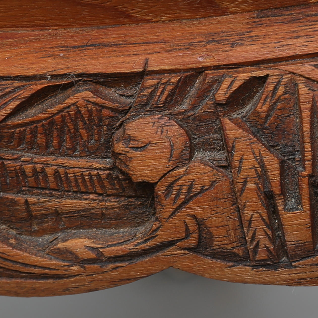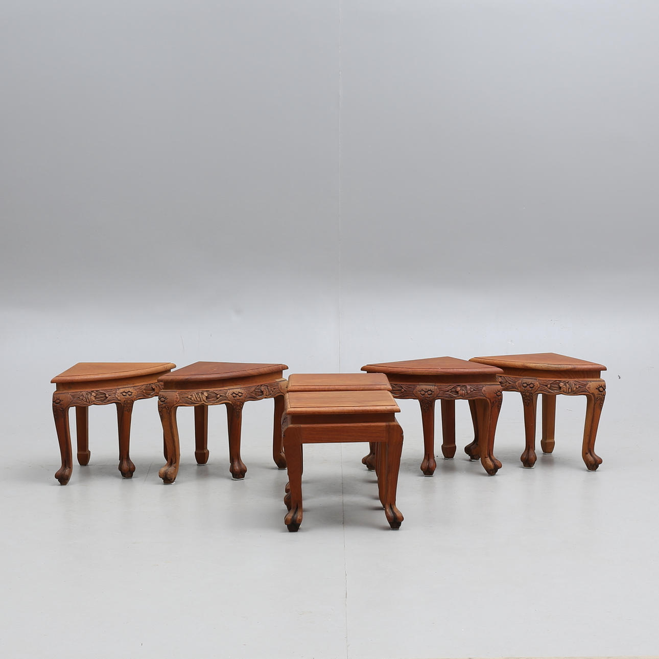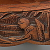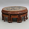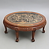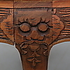 Bord med glasskiva, skuren dekor, höjd, 50,5 cm, 130 x 79 cm. Pallar, 6 stycken, höjd 33,5 cm.