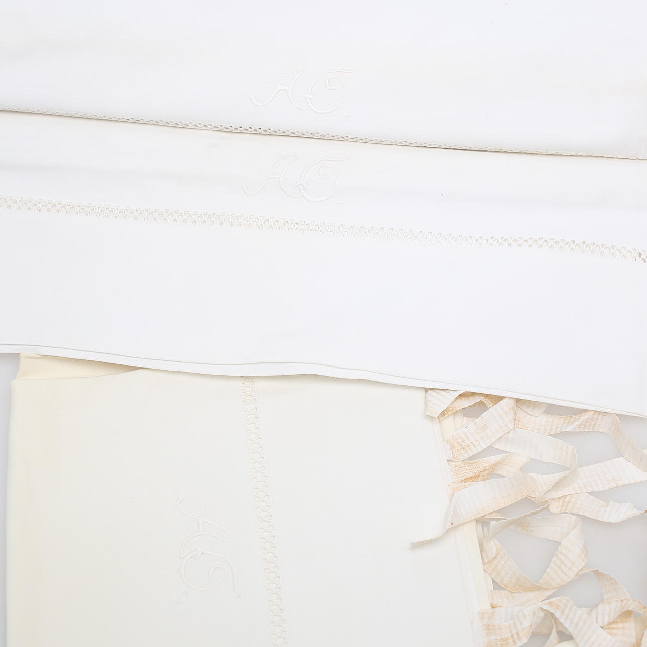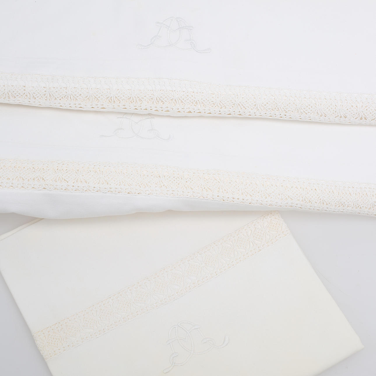 805503. LAKAN, hemvävda. Spets och brodyr, monogram.