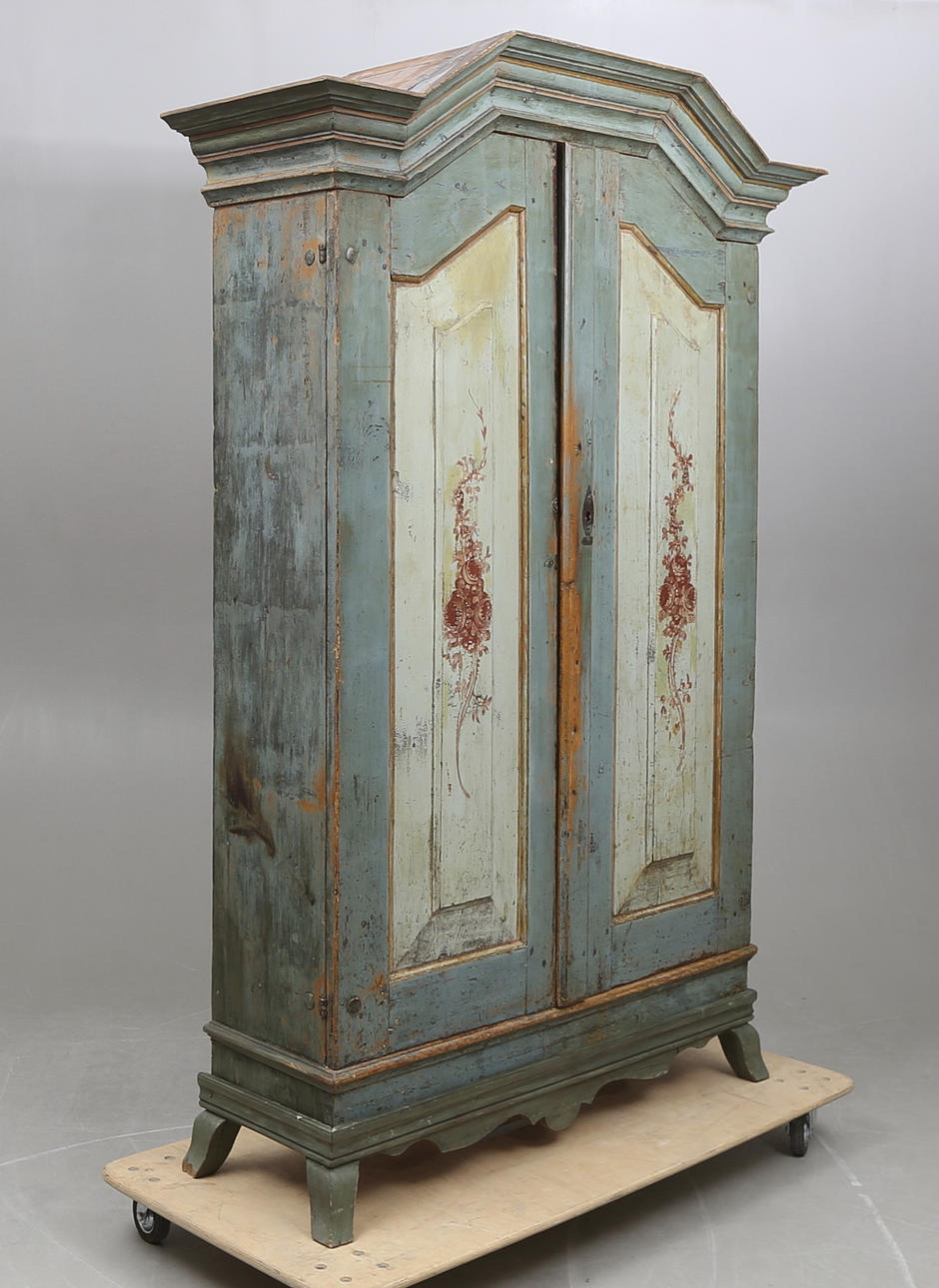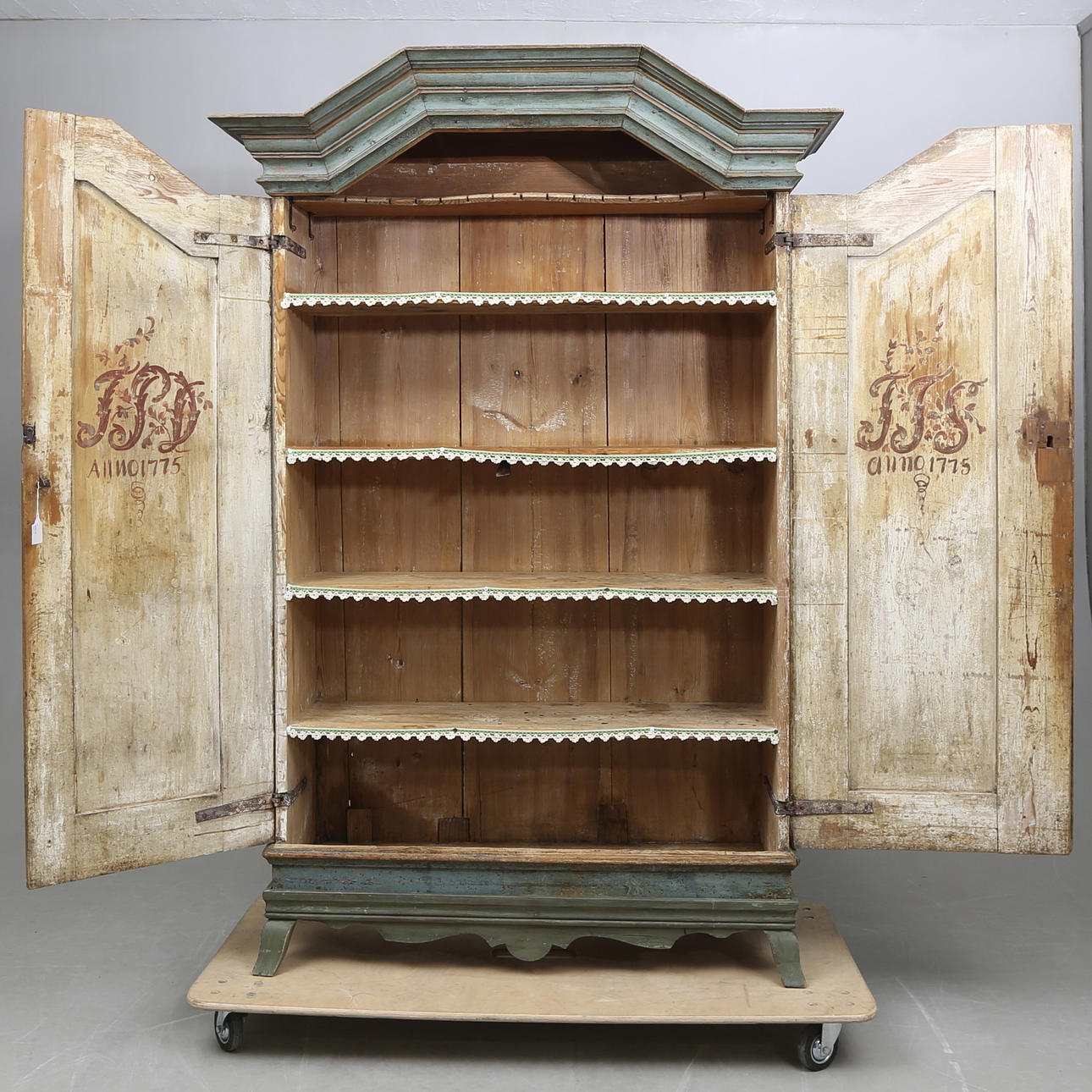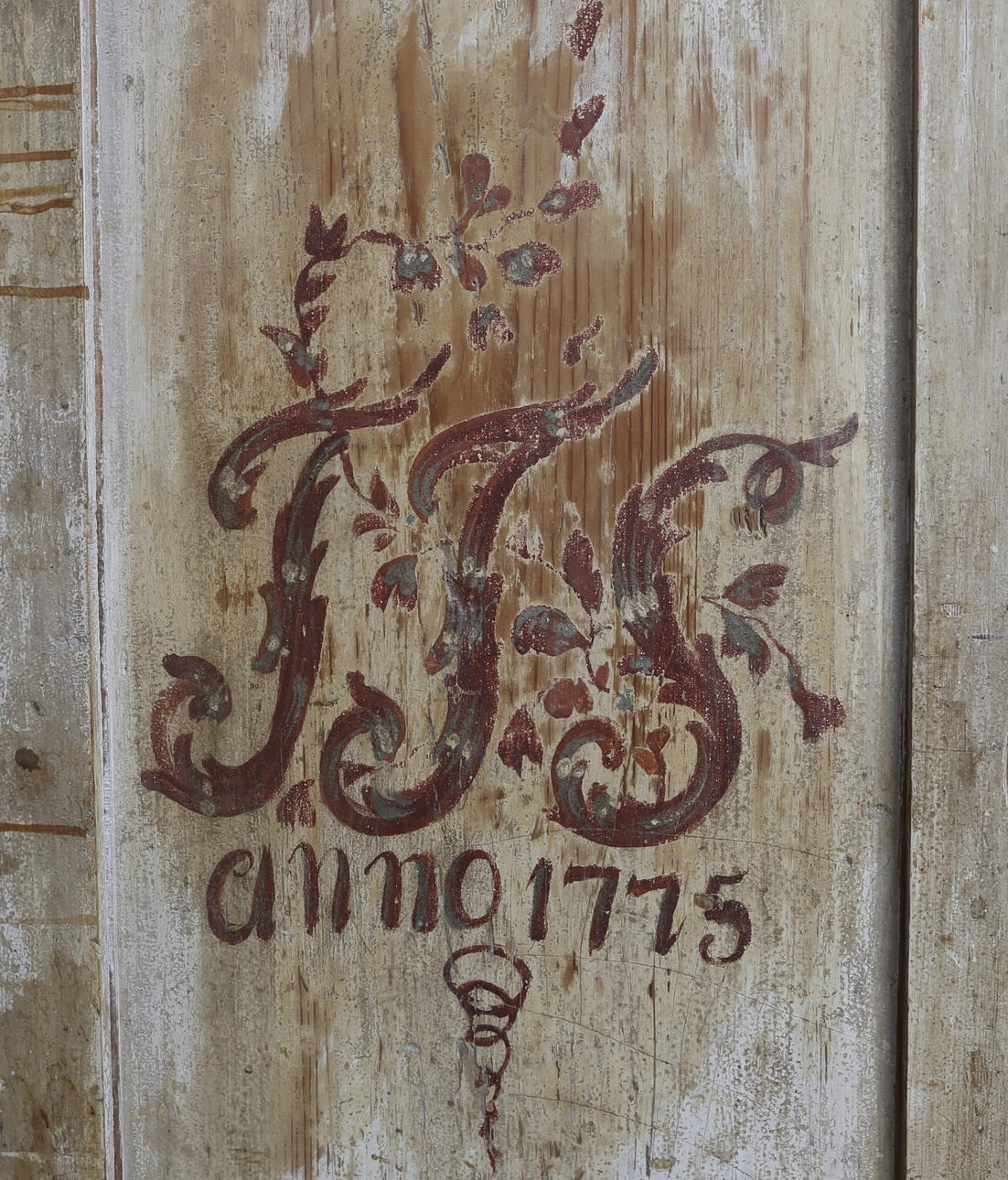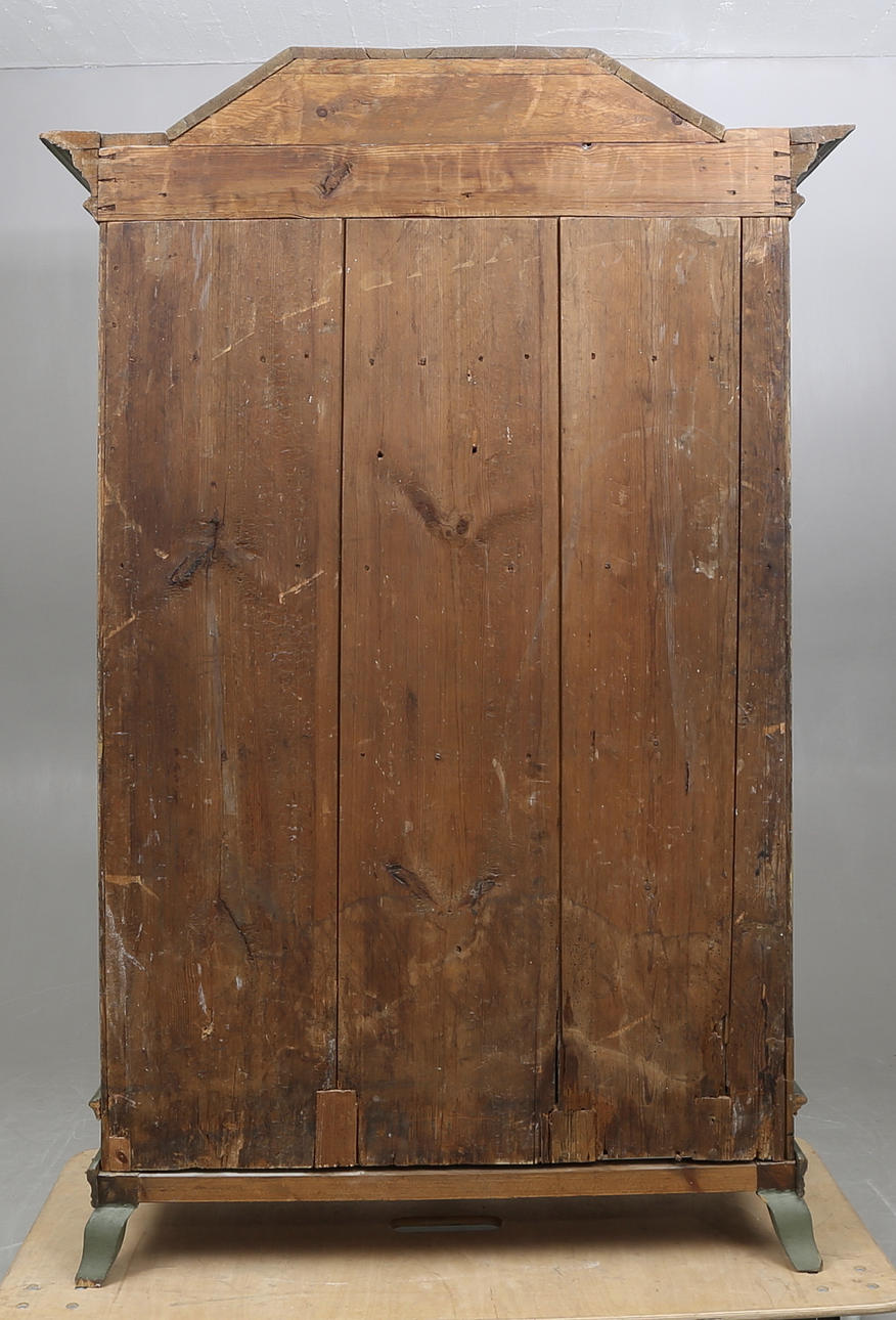 Bemålat. Svängda ben. Daterat 1775. Längd ca. 140, bredd 46, höjd 208 cm.