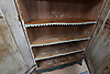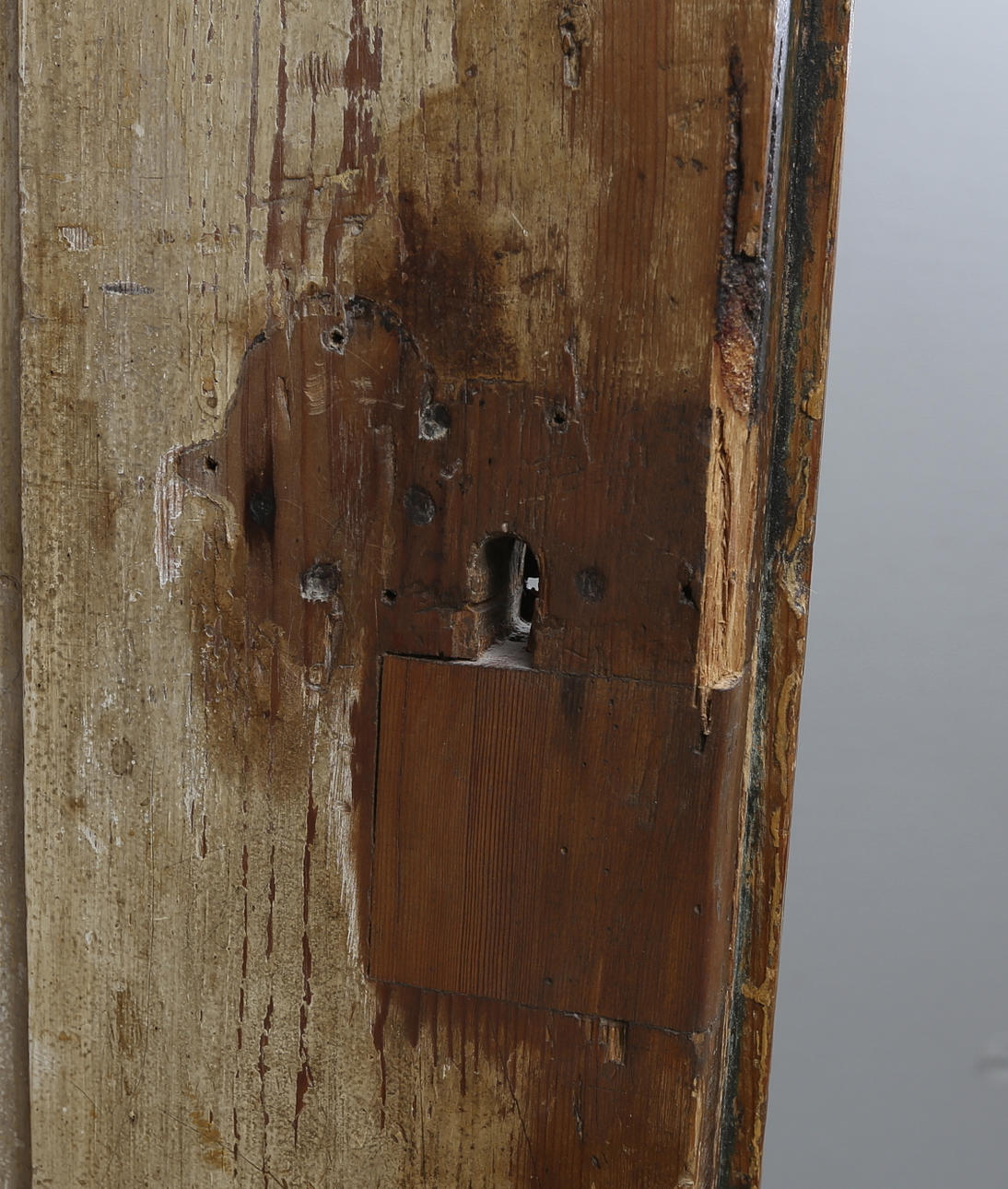 Torrsprickor. Åldersrelaterat slitage. Maskstunnget. Renoverat och kompletterat. Lås saknas. Ben med sprickor och avslag.