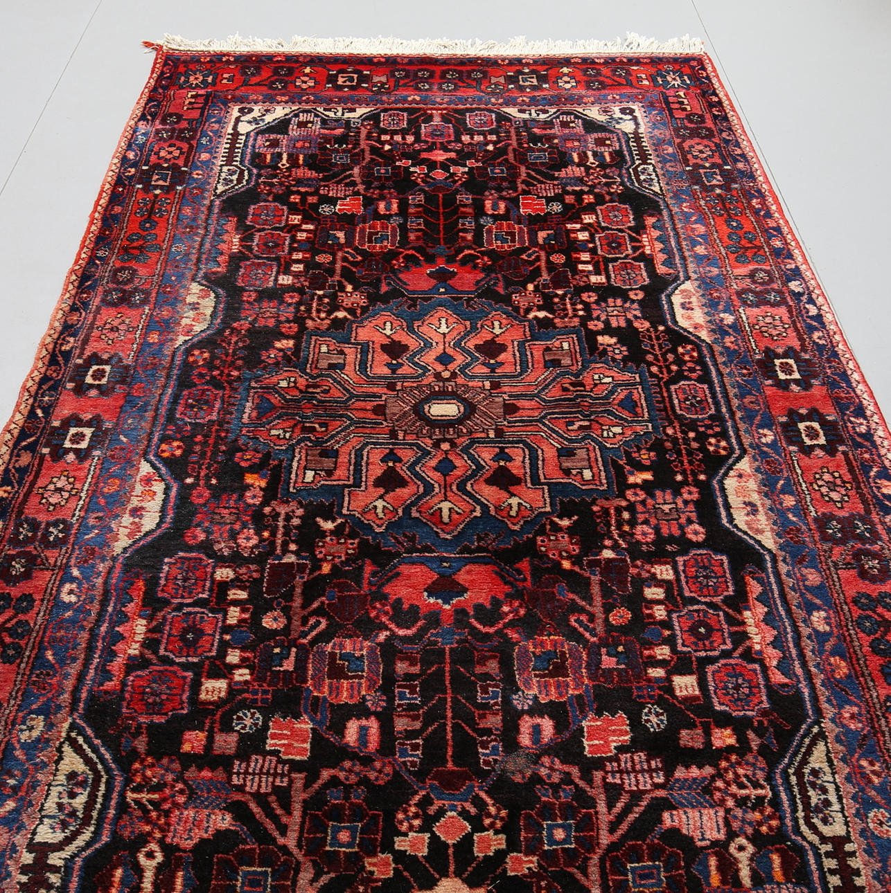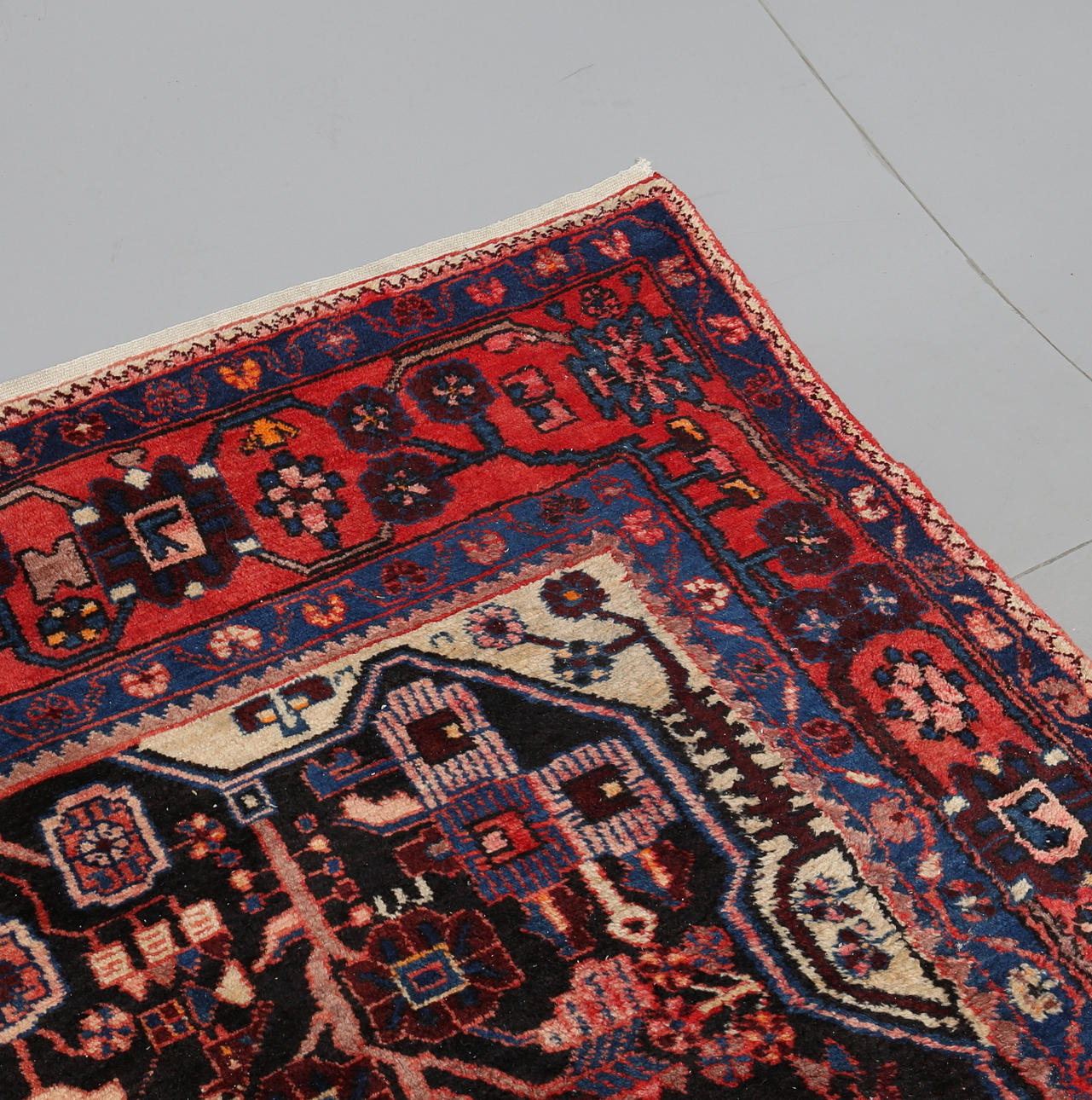 Bruksslitage. Fläckar och märken. Något solblekt. Fransar endast på ena sidan.