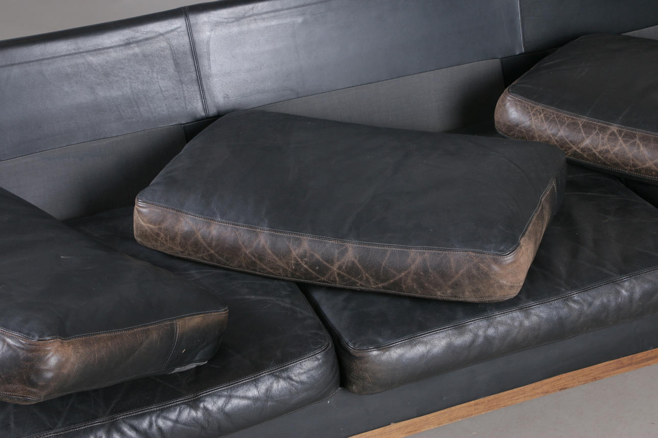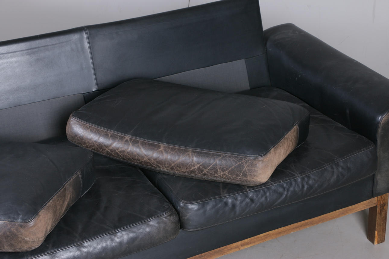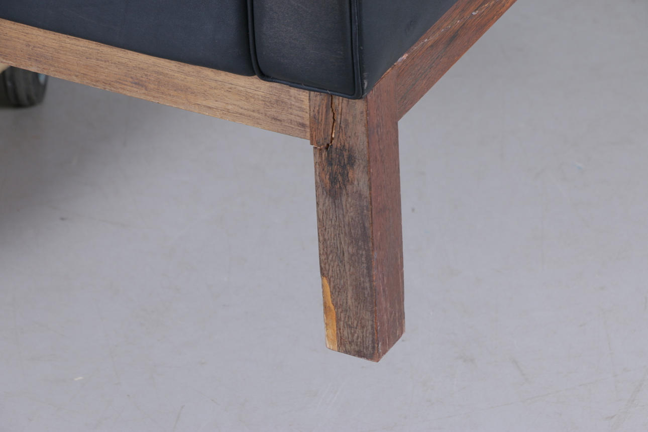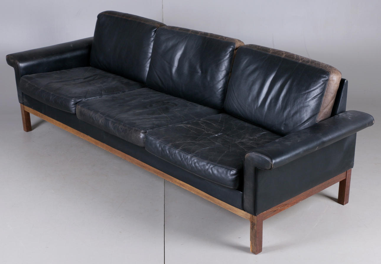 Skavmärken, skinn med slitage, fläckar på tyget under dynorna, ena benet med fanérbortfall, ena kortsidans stomme med lagning.