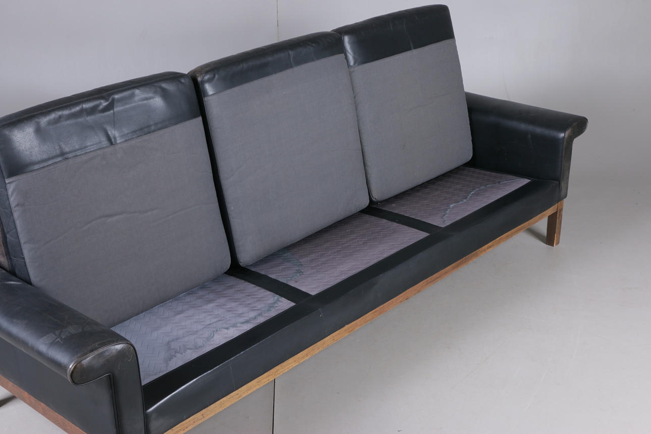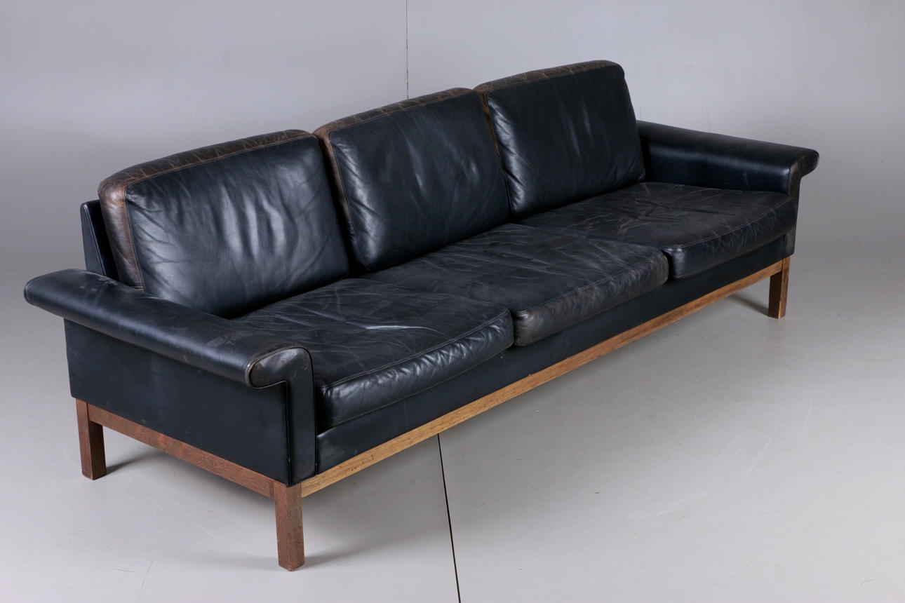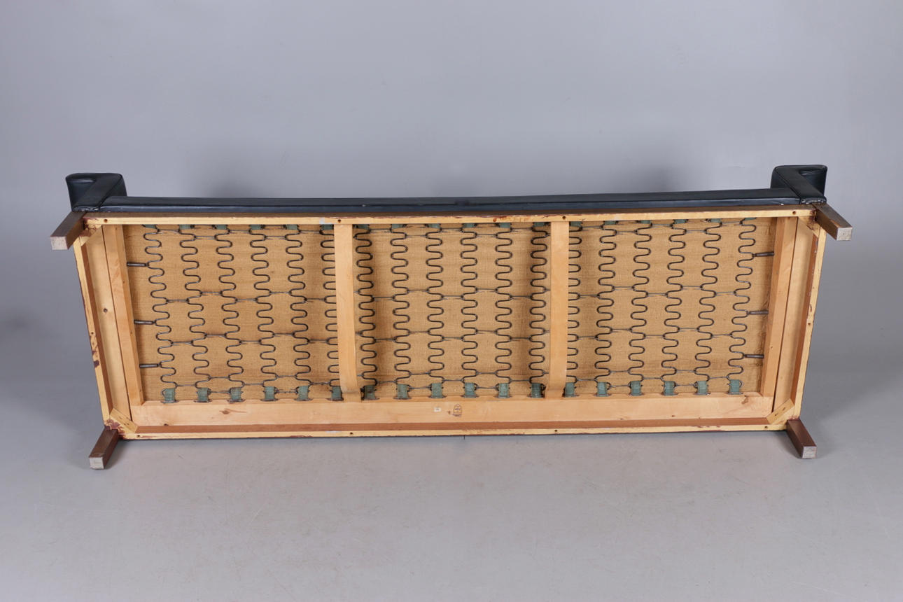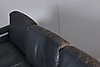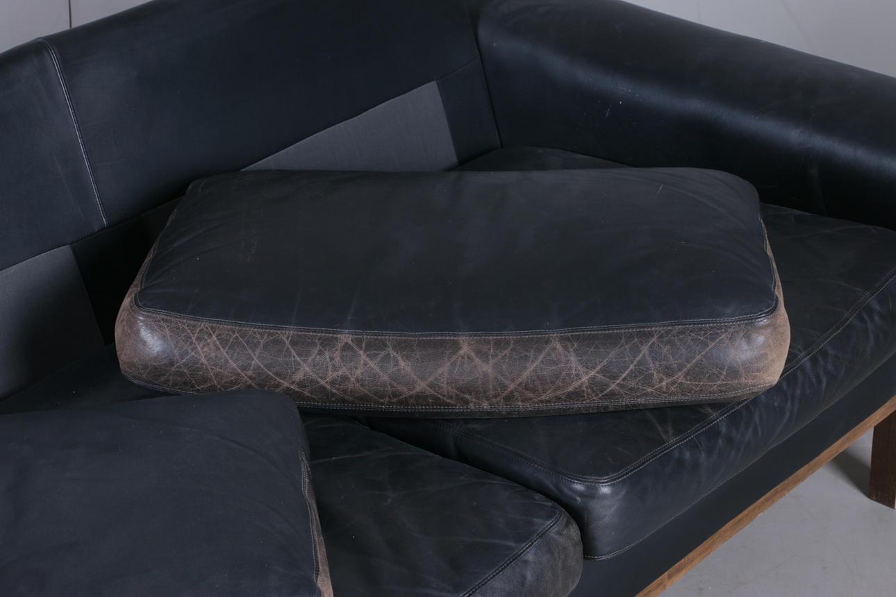 Skavmärken, skinn med slitage, fläckar på tyget under dynorna, ena benet med fanérbortfall, ena kortsidans stomme med lagning.