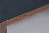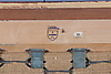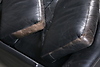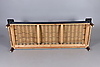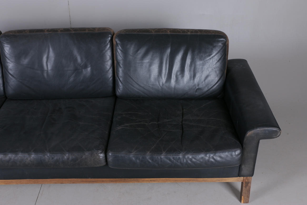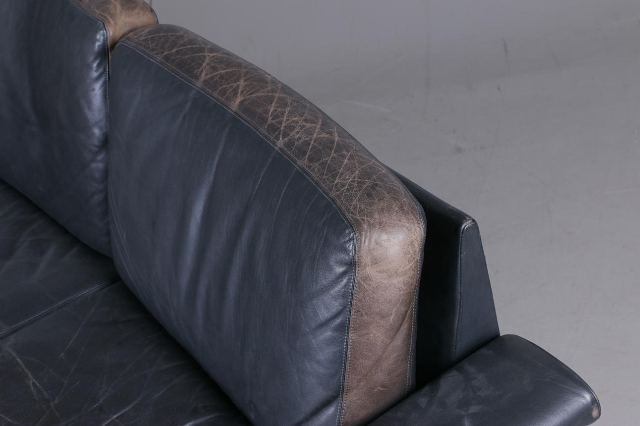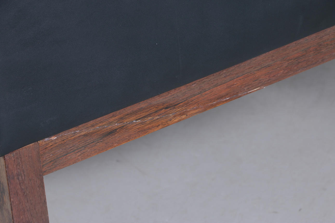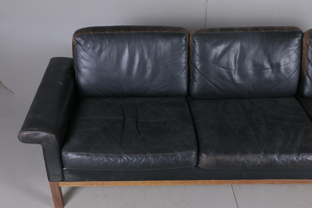 Skavmärken, skinn med slitage, fläckar på tyget under dynorna, ena benet med fanérbortfall, ena kortsidans stomme med lagning.