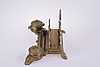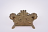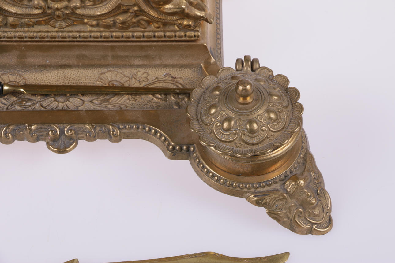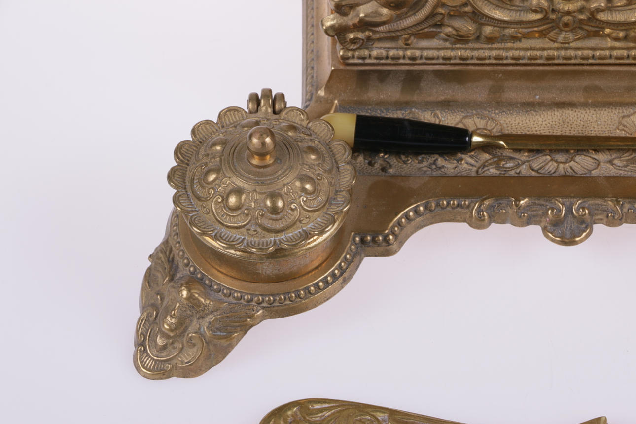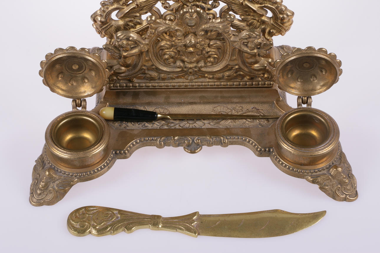 Skrivbordsuppsats i mässing med brevställ och två bläckhorn, insatser i mässing. Längd ca: 29 cm, bredd ca: 19 cm. Medföljer två brevknivar/knivar.