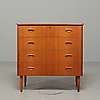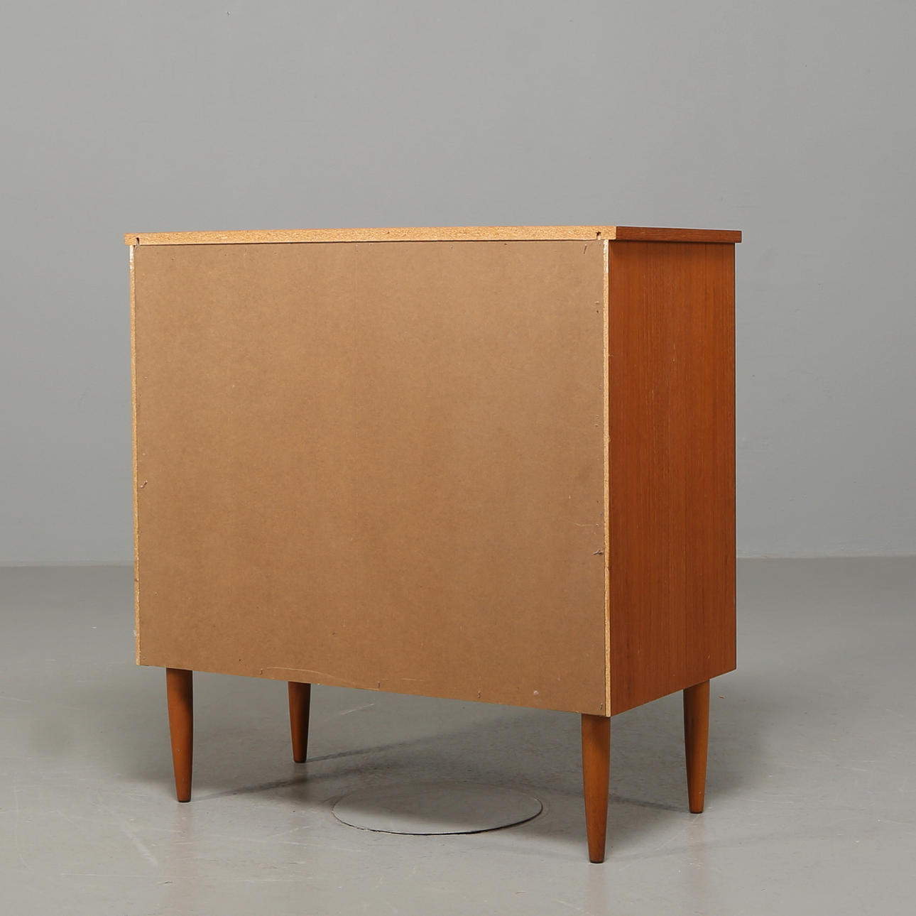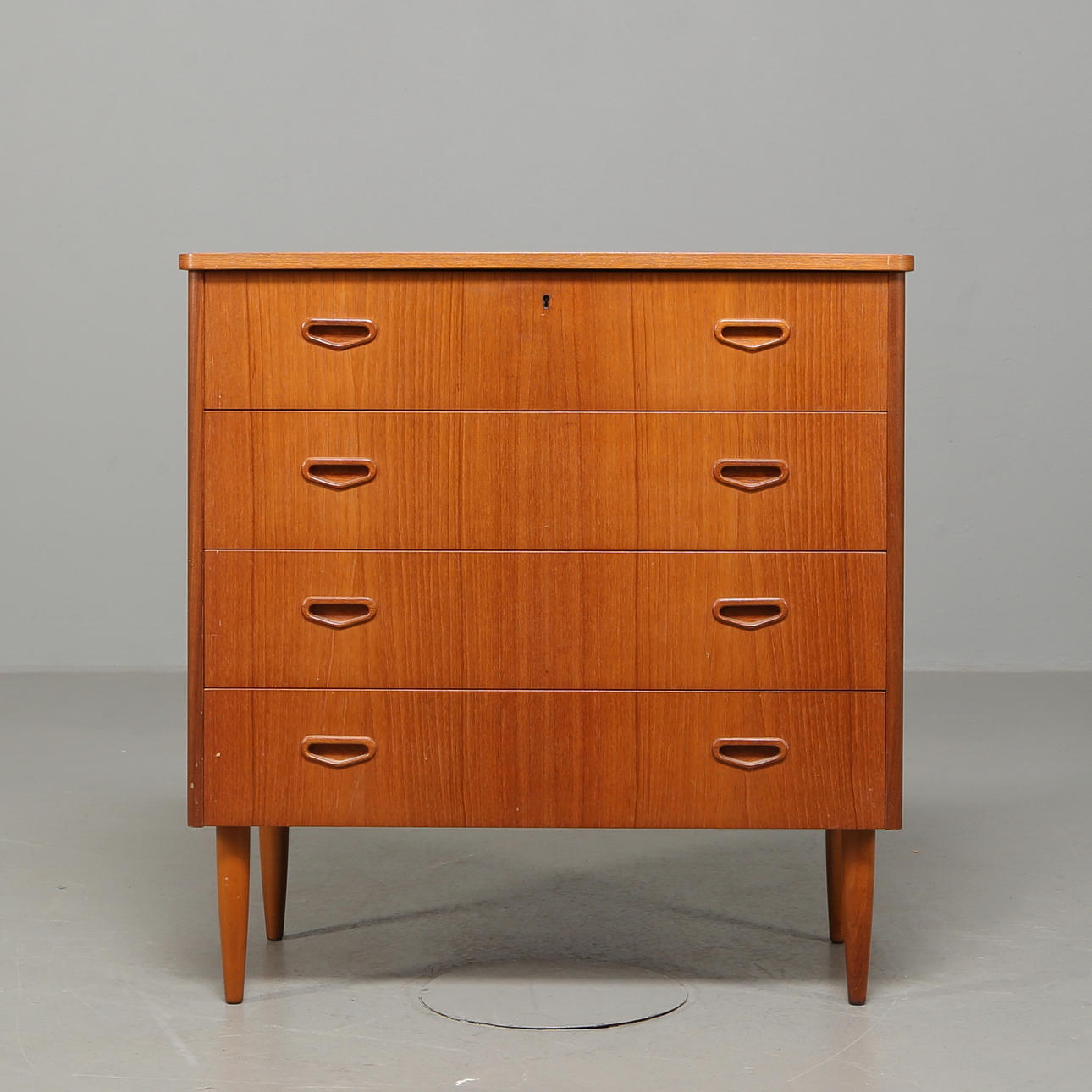 Fyra lådor med skålade dragbeslag av massiv teak. Längd 82 cm Djup 41 cm Höjd 85 cm.