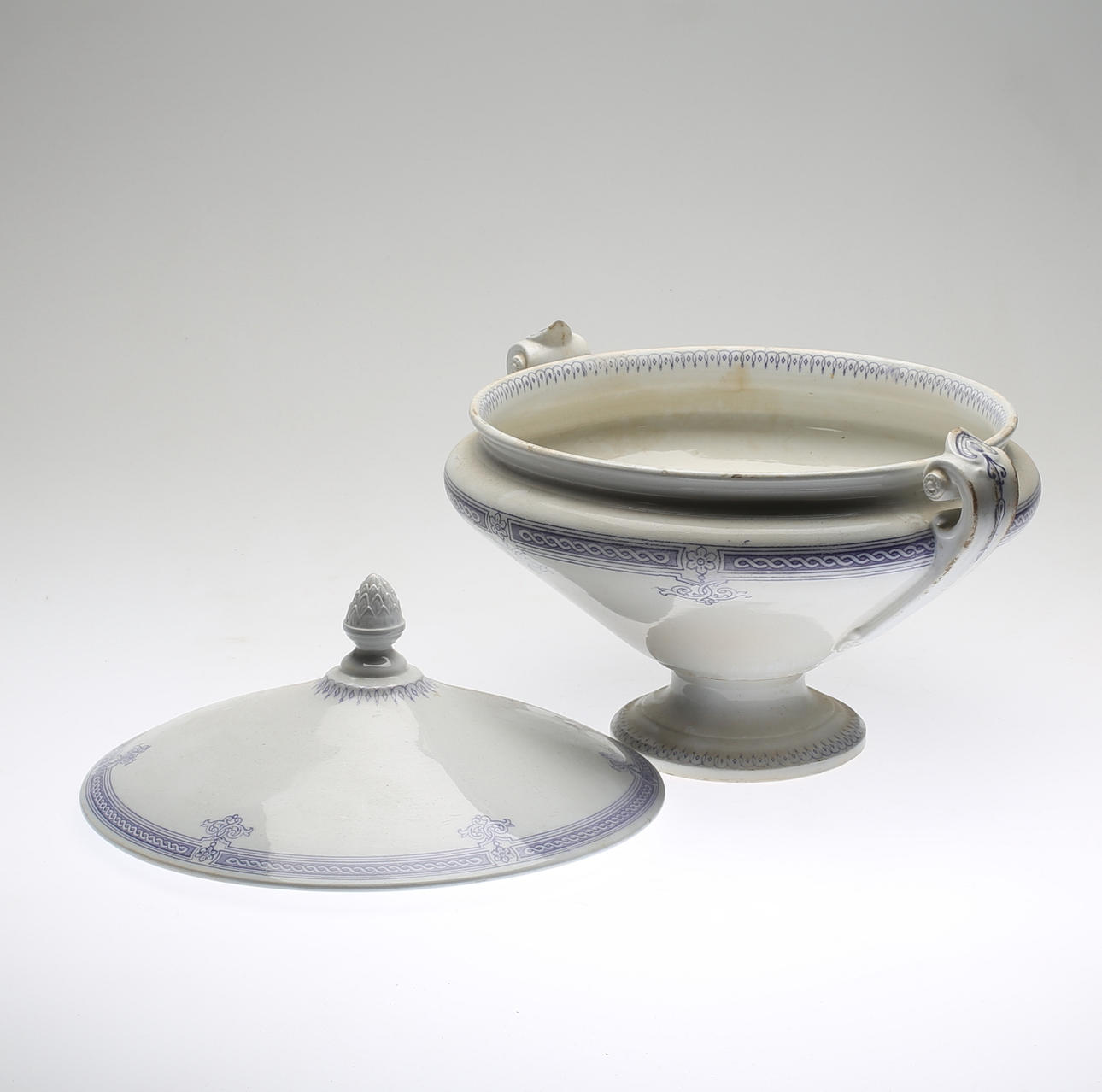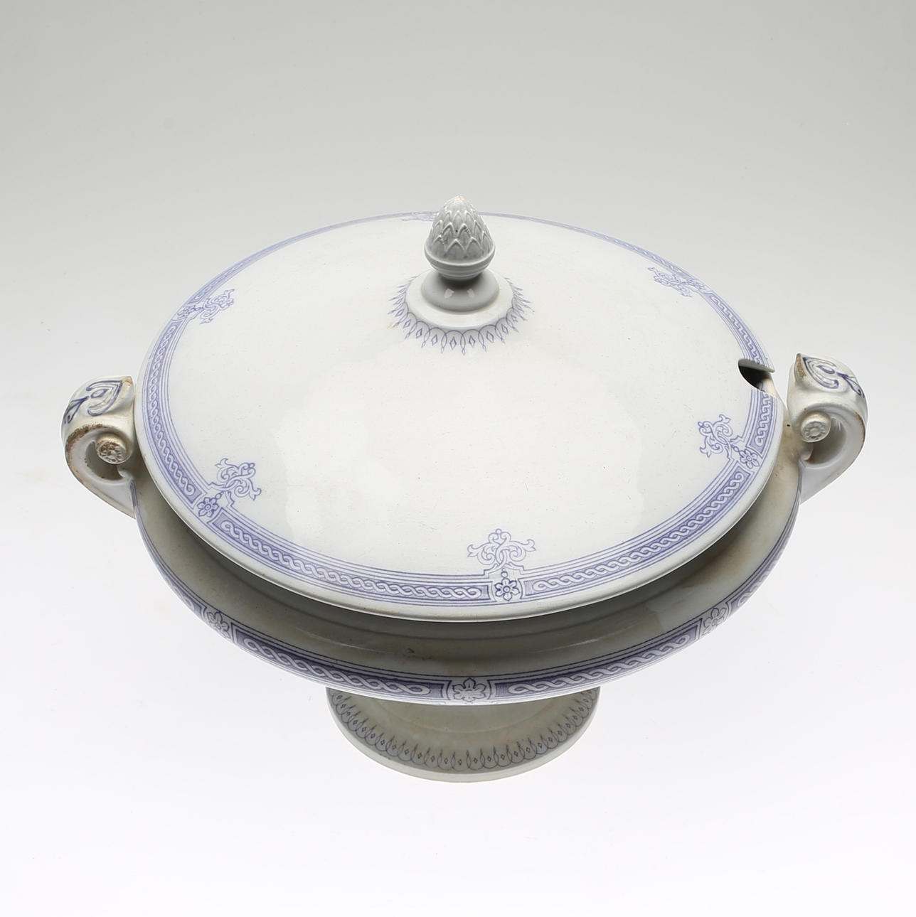 Ålders- samt bruksslitage. Slitage på glasyr. Repor och krackelyr. Mindre nagg.