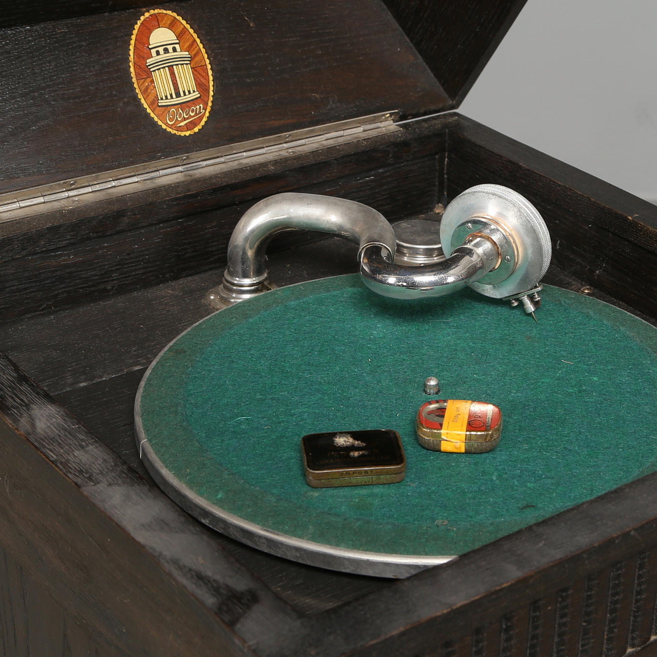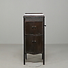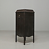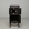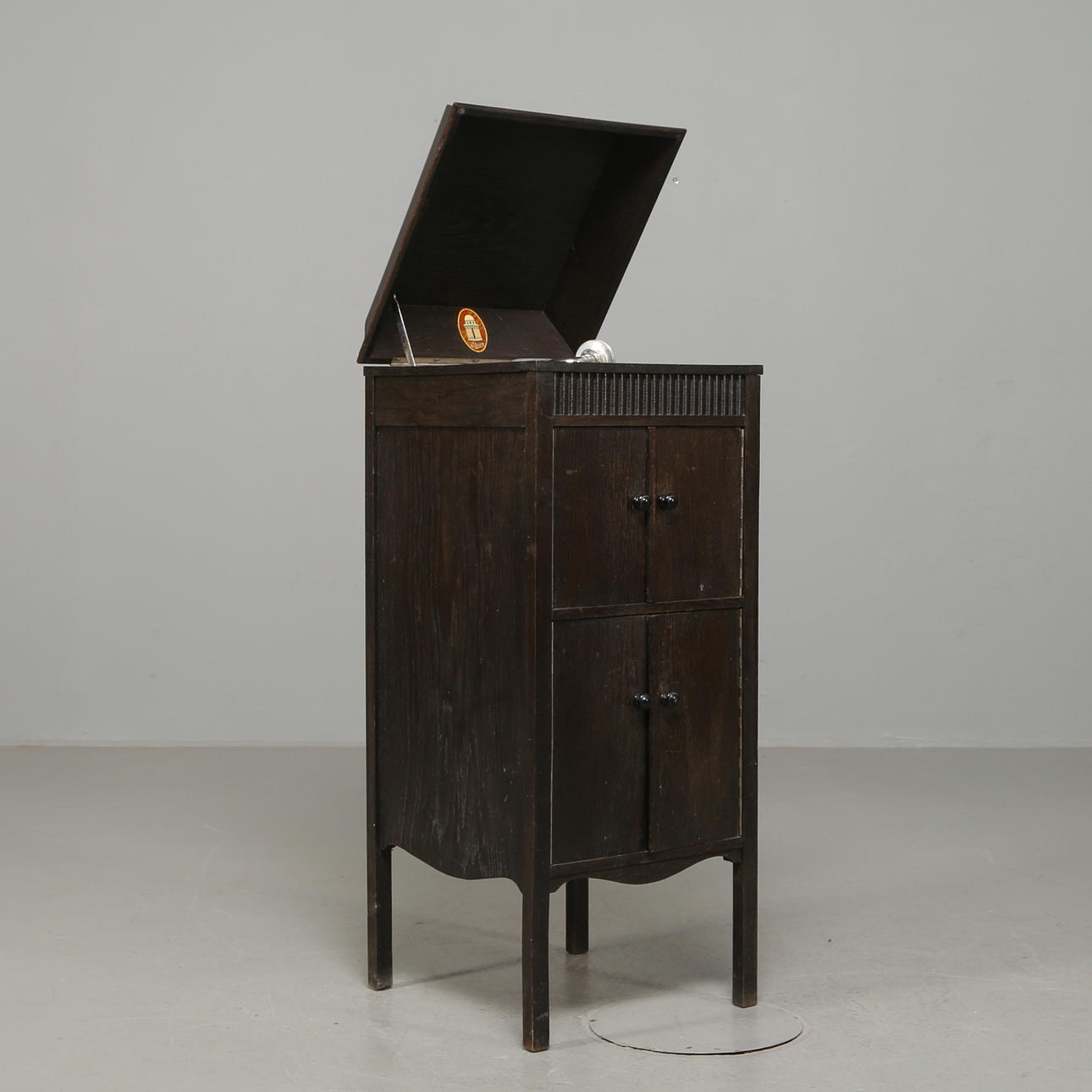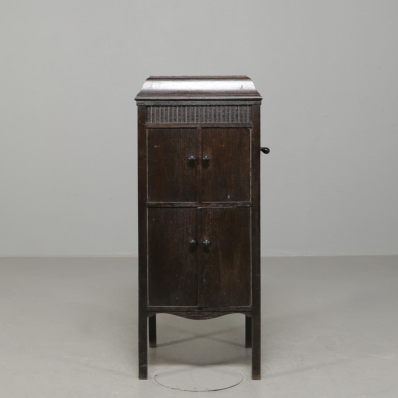 Mörkbetsad ek, skåp med skivförvaring nederst, högtalare, höjd 105 cm, längd 43 cm, bredd 45 cm.