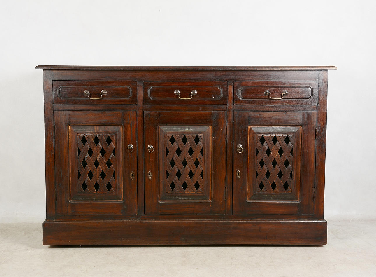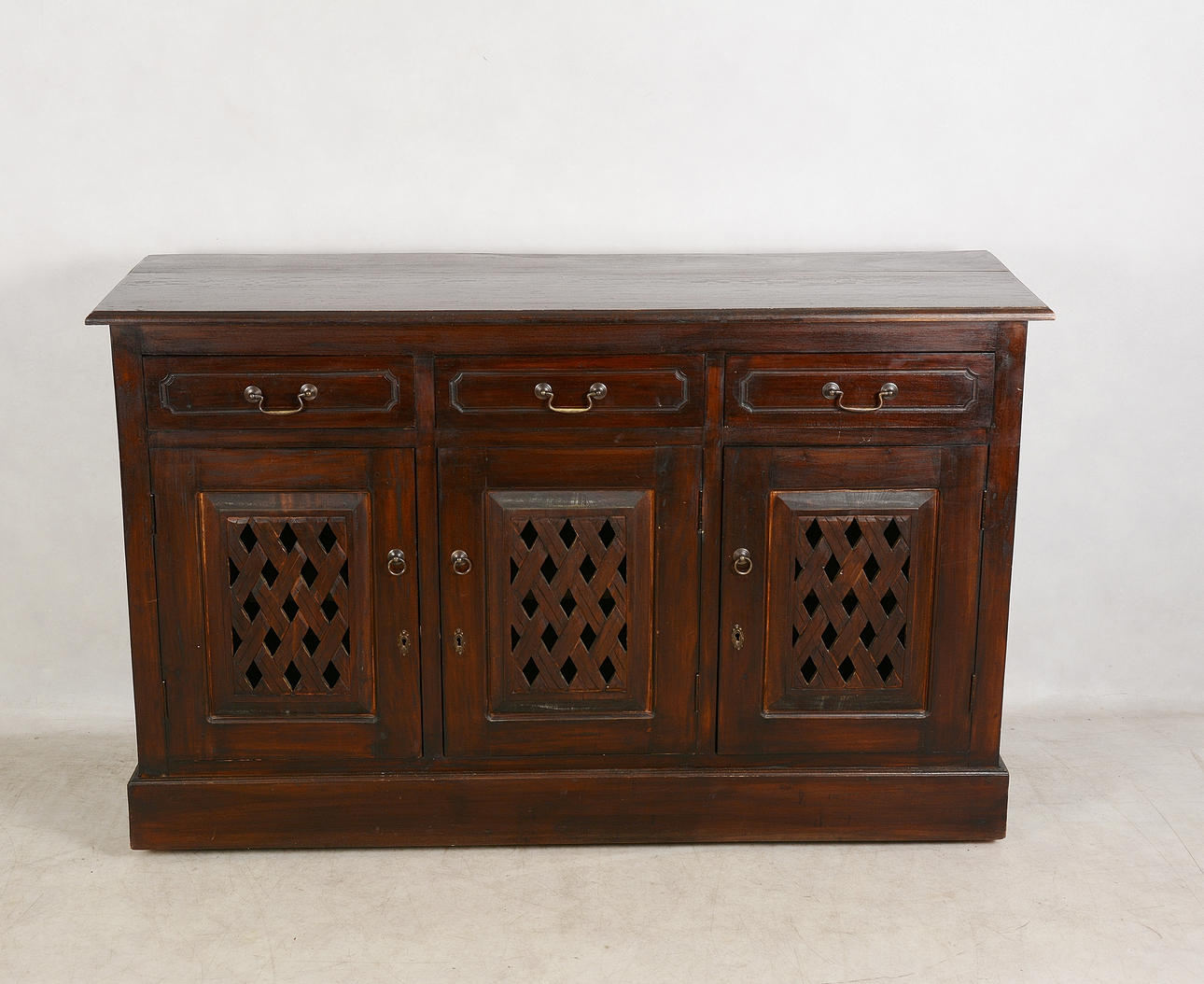 Sideboard med tre lådor, längd 146, bredd 45, höjd 90 cm.