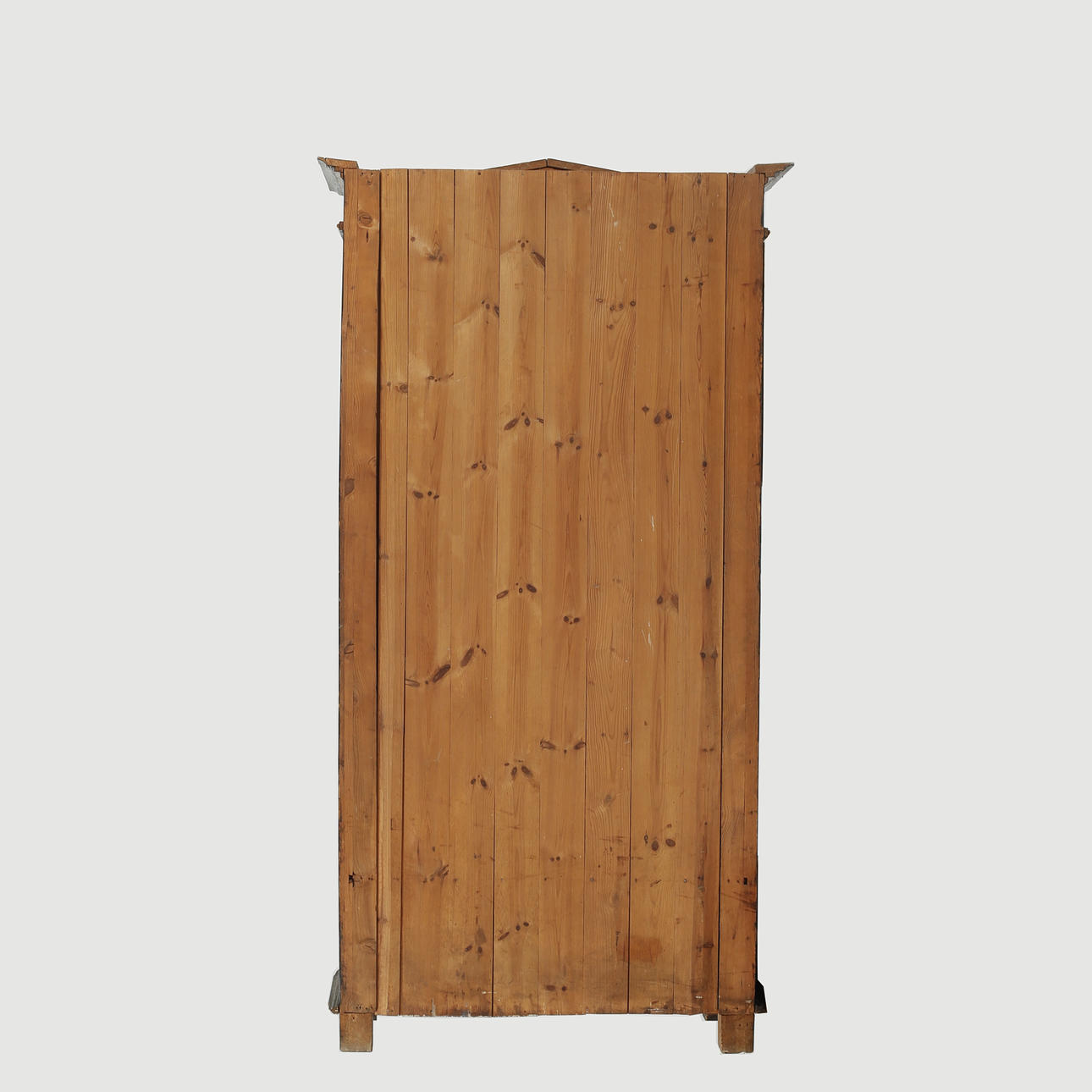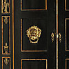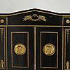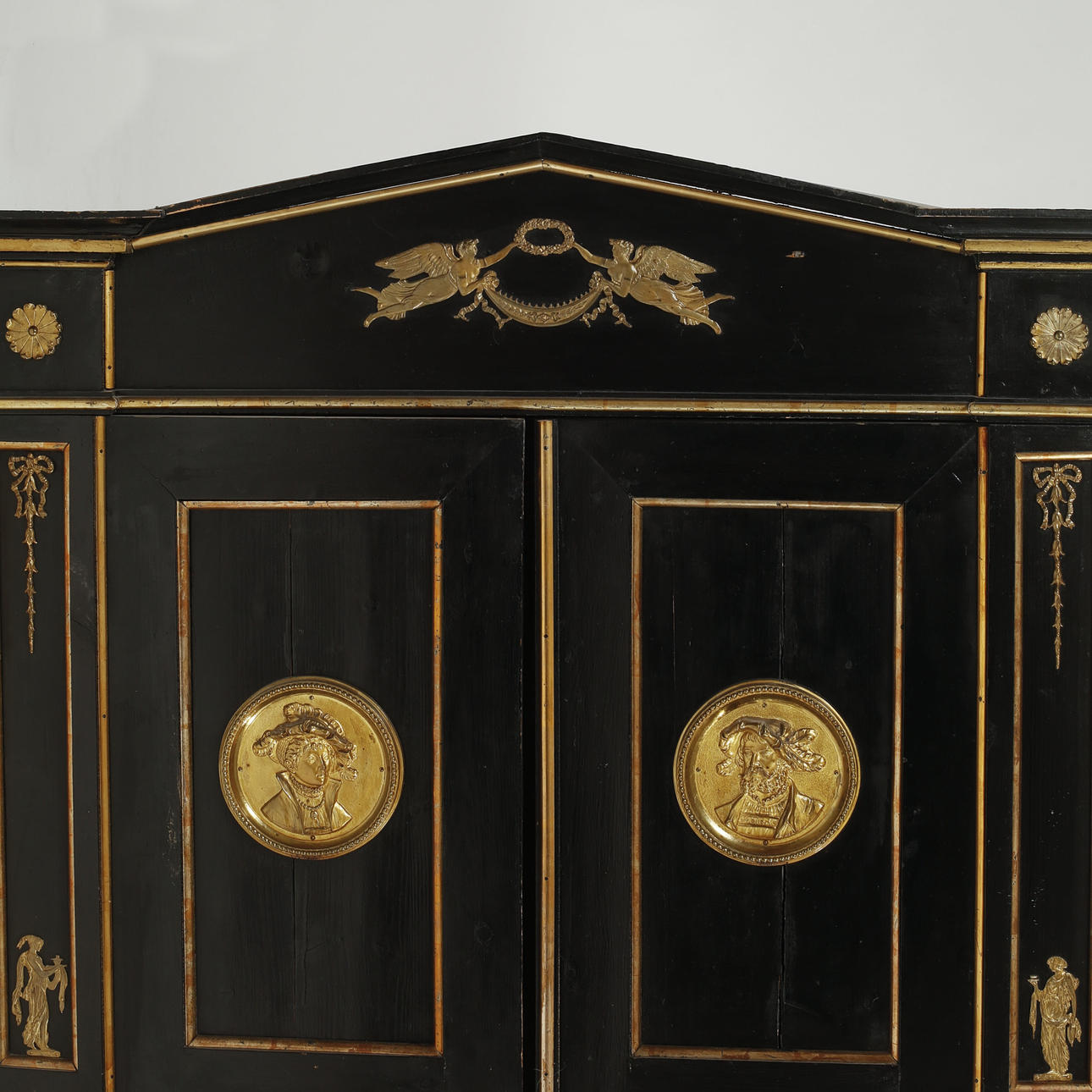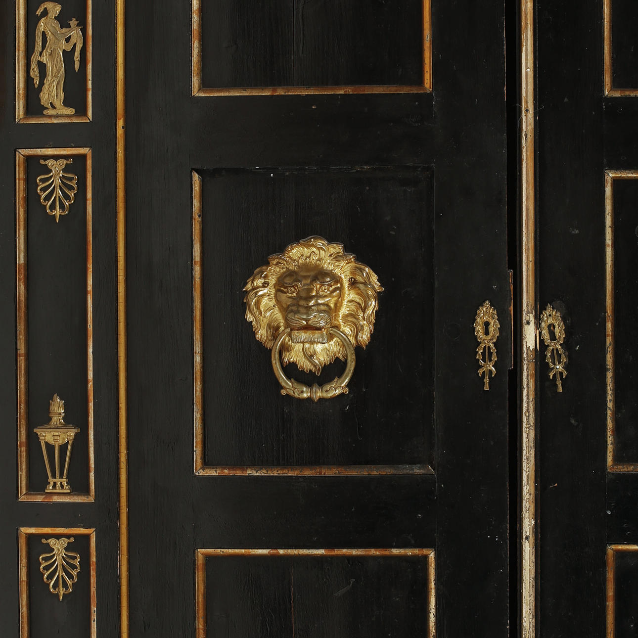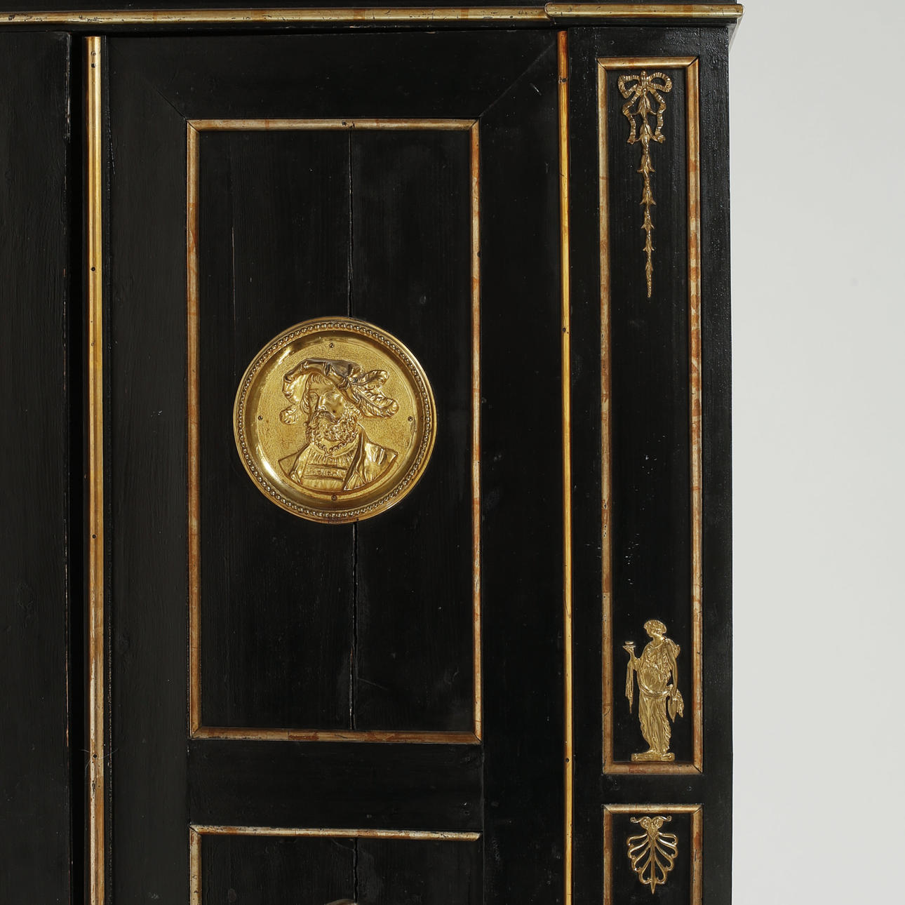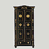 Svartmålad med beslag i mässing, längd 110 cm, bredd 58 cm, höjd ca 230 cm.