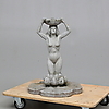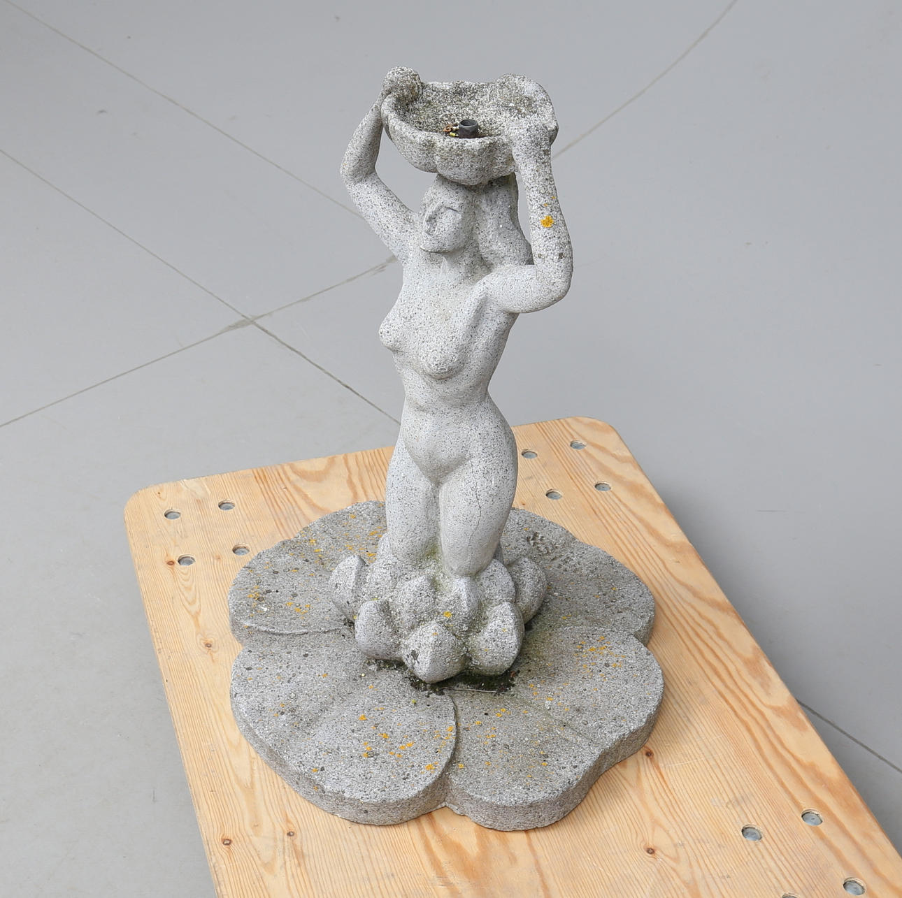 Naken kvinnofigur på näckrosblad. Otydligt signerad. Diameter ca 44. Höjd ca 64 cm.