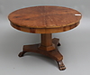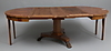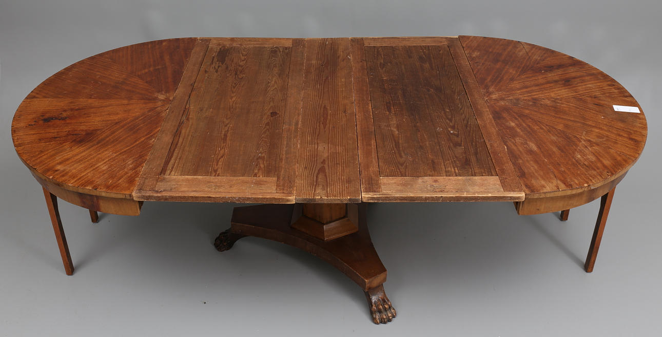 Mahogny, inklusive 3 iläggsskivor, diameter 120, höjd 75, skivornas bredd 50 + 50 + 20 cm.