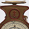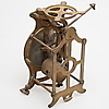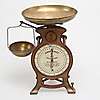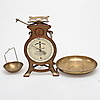 Gjutjärn,emaljerad tavla, skålar av mässing.