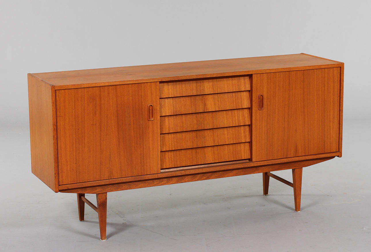 Teak, 5 lådor, 2 dörrar med invändig hyllinredning, höjd 80cm, längd 160 cm, djup 42 cm.