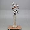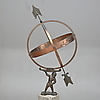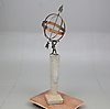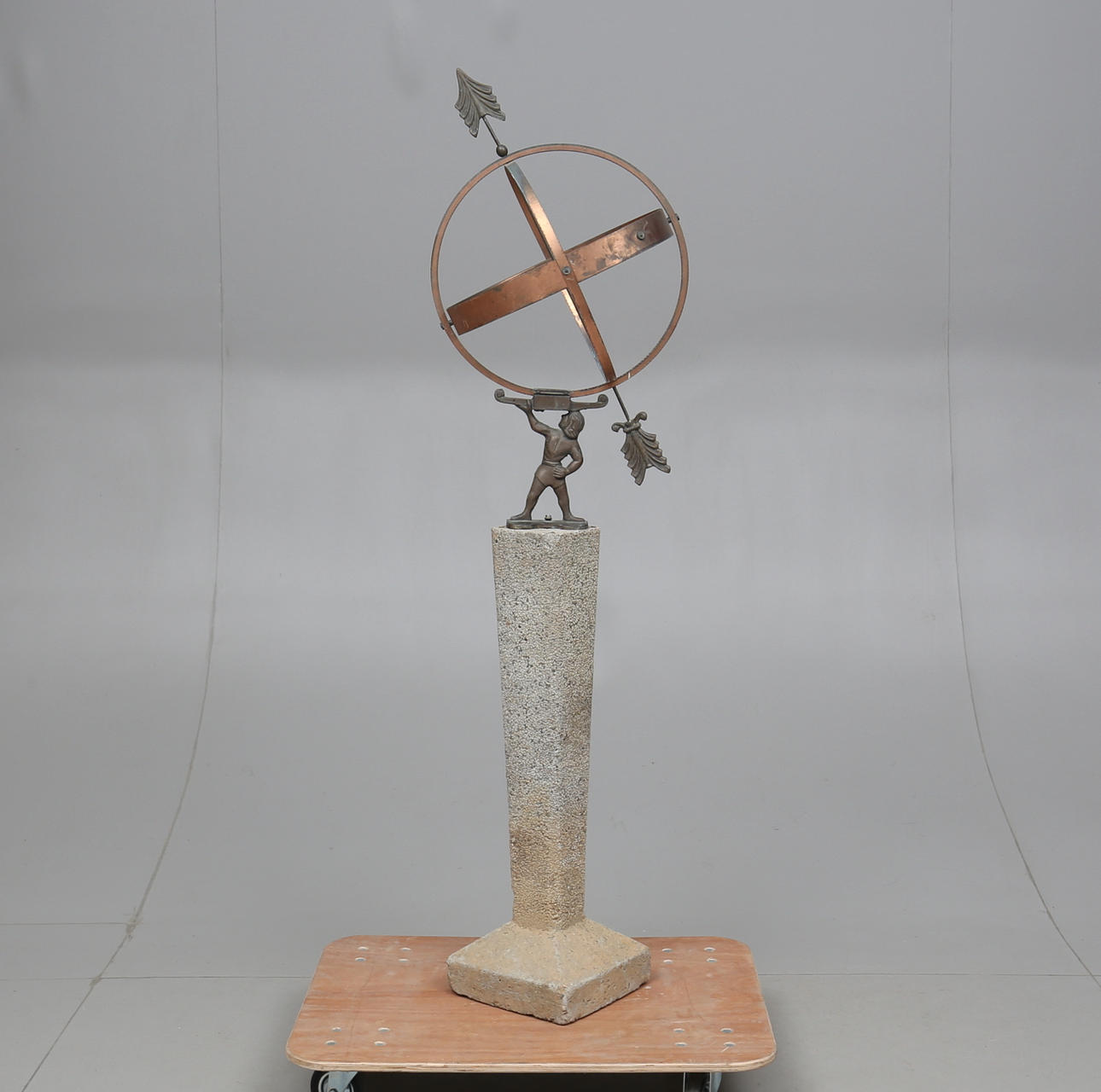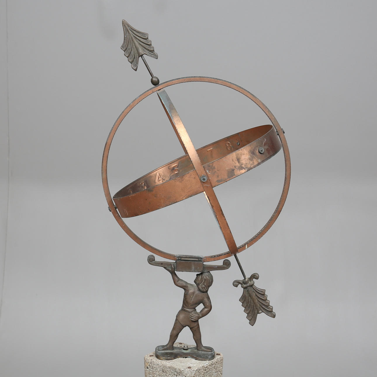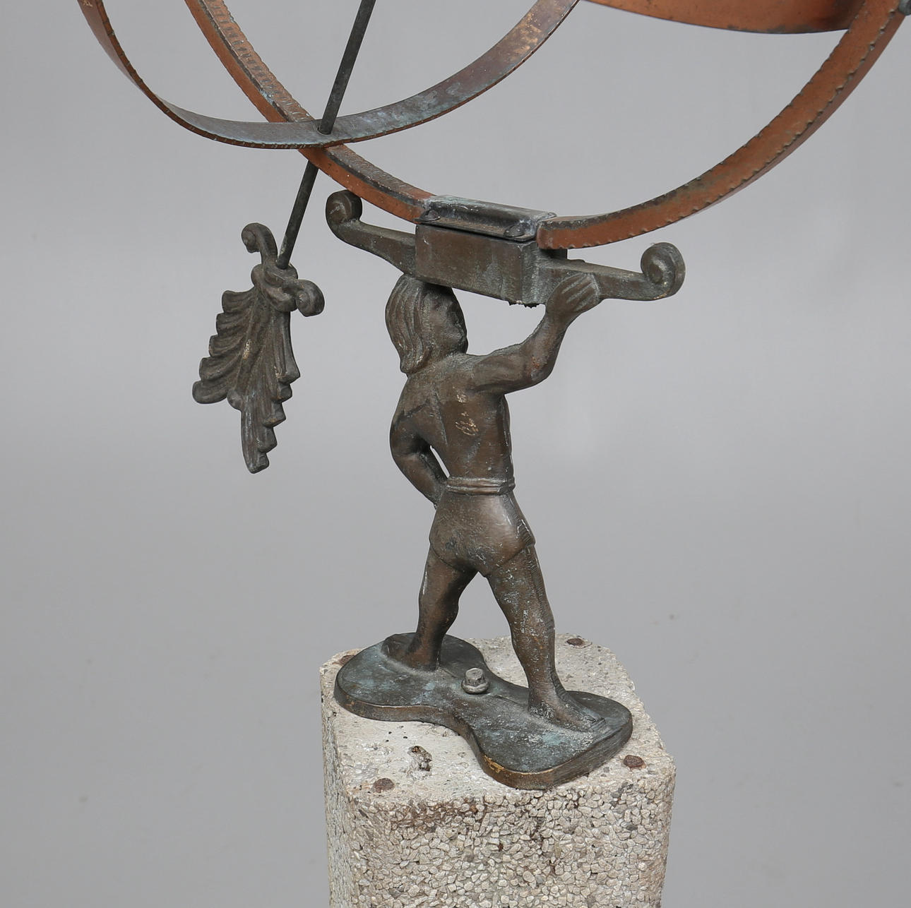 Solur i koppar uppbärandes av en atlasfigur i gjutjärn. Sockel i stenmassa. Totalhöjd ca 163 cm.
