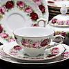12 koppar med fat, kopparnas höjd 5 cm, fatens diameter 13 cm. 12 assietter, diameter 16,5 cm. 1 sockerskål samt 1 mjölkkanna.