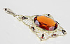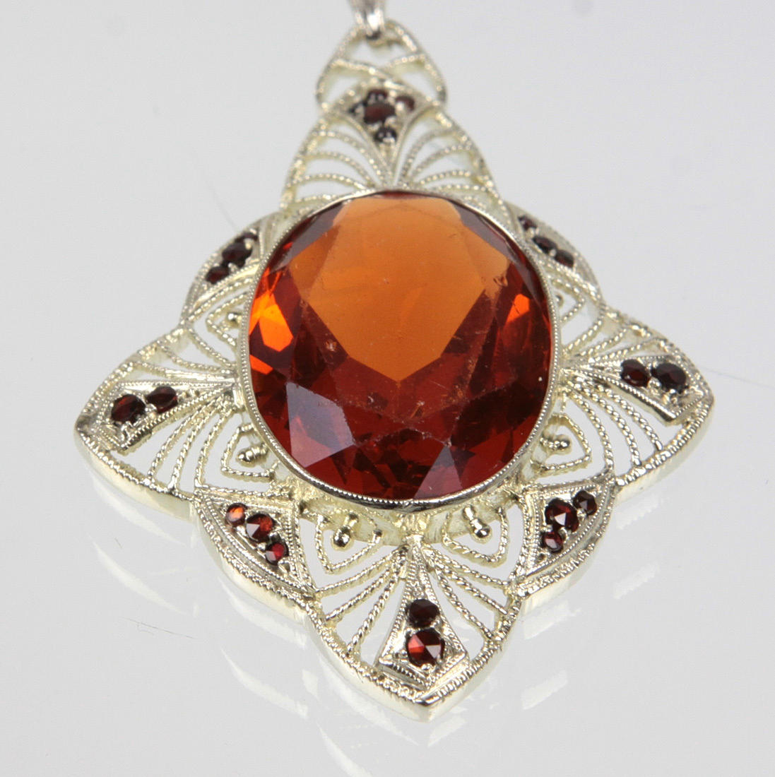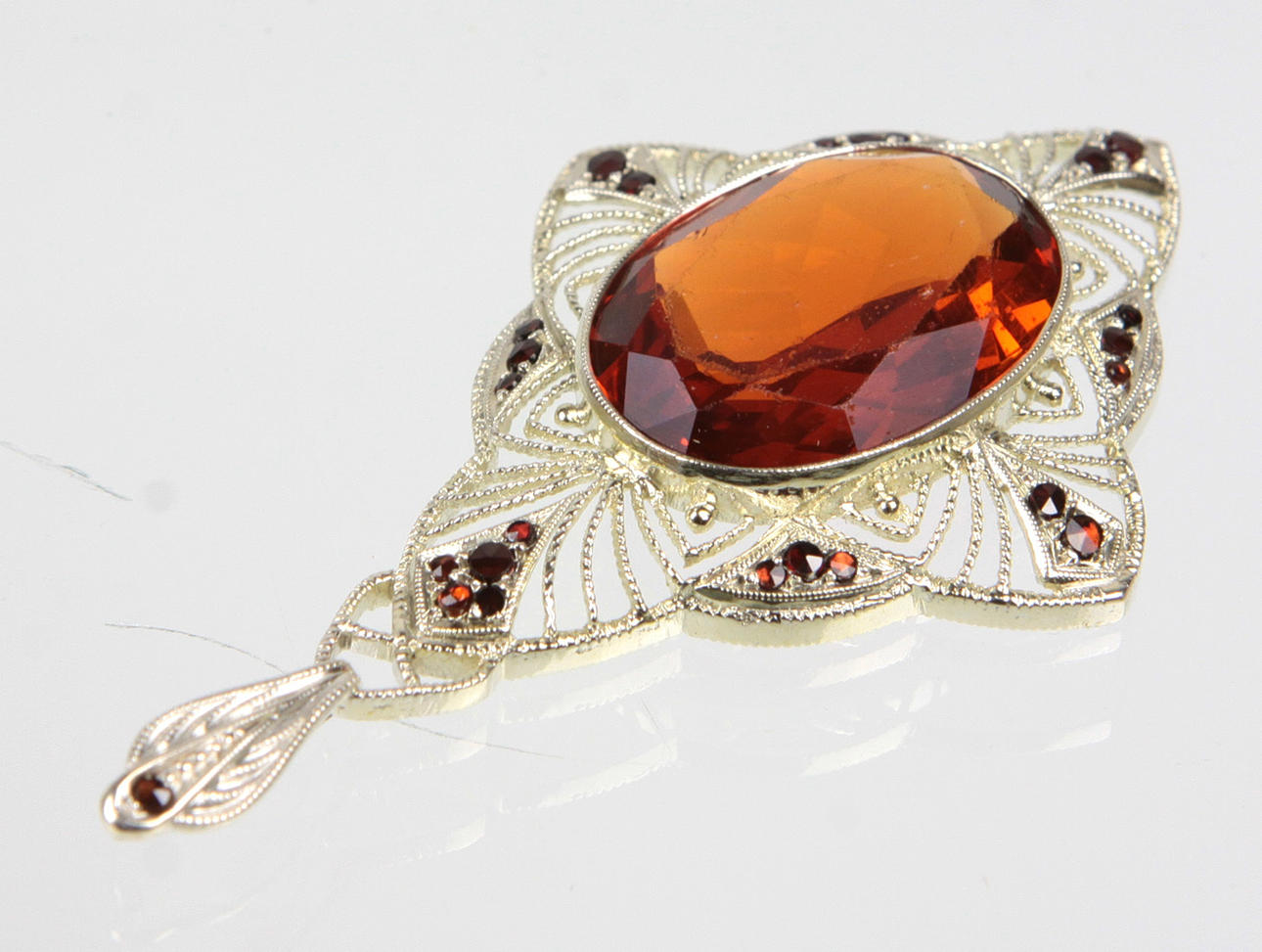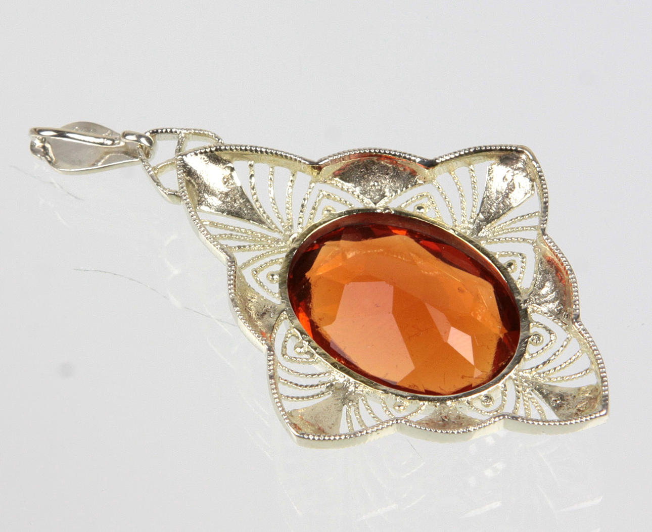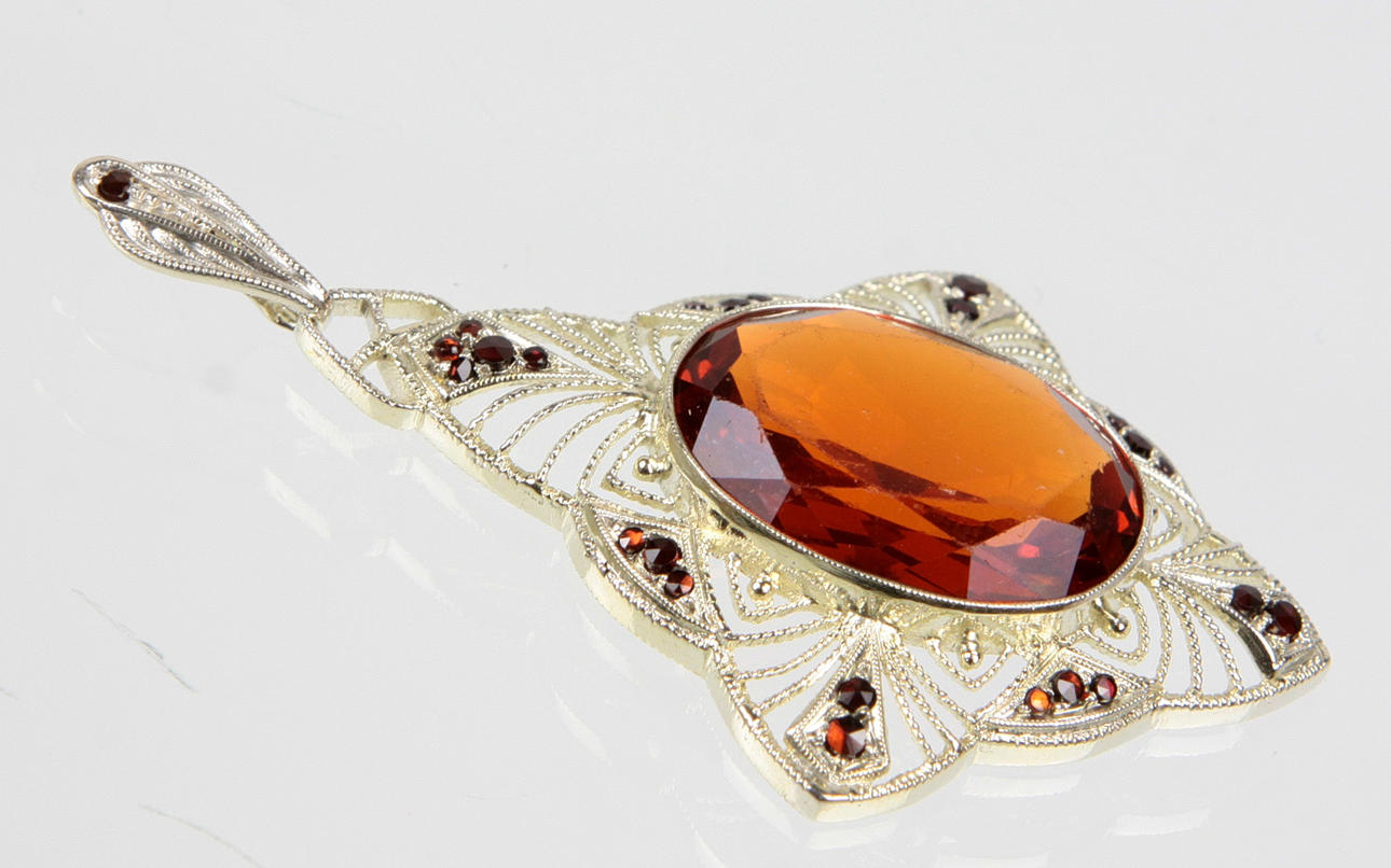 mycket filigran hänge av 800 silver, tillverkat omkring 1920. I mitten med en fasetterad Madeira Citrin färgad ädelsten och på sidan med små stenar av samma färg, längd 5,6 cm, bredd 3,2 cm, vikt 8,7 gram, sällsynt i detta tillstånd.