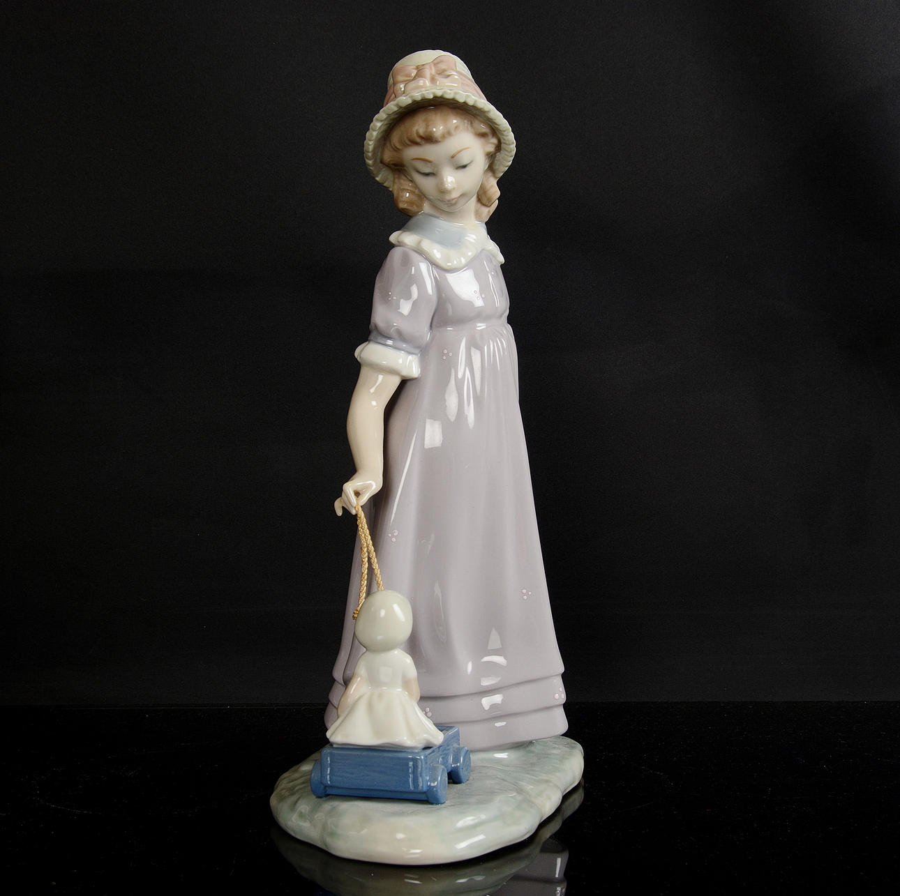 Flicka dragandes barn i vagn. Höjd 27 cm.