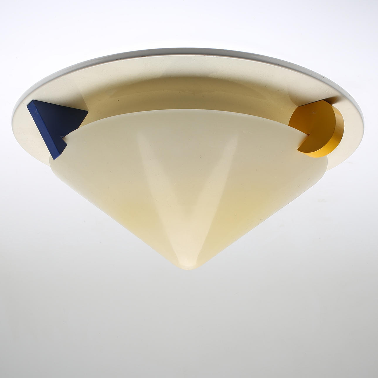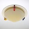 Stomme i metall med målade geometriska klossar i trä, avtagbar kupa i plast. Två ljuspunkter. Diameter ca 45 cm, höjd ca 19 cm.