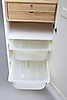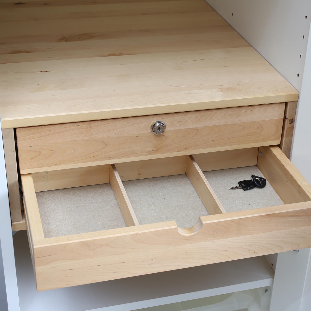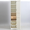 854344. GARDEROB, låsbara trälådor, plastbackar.