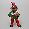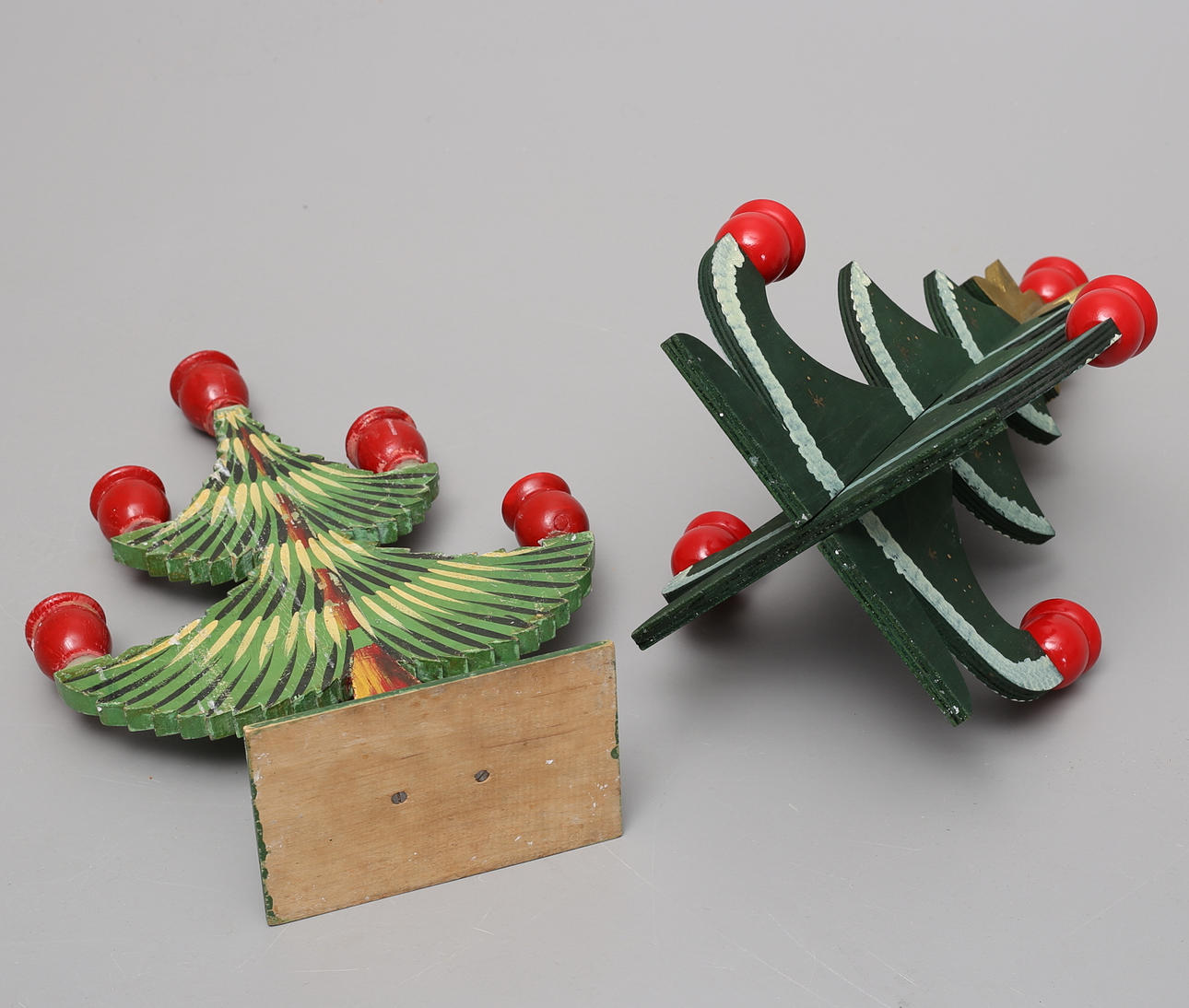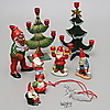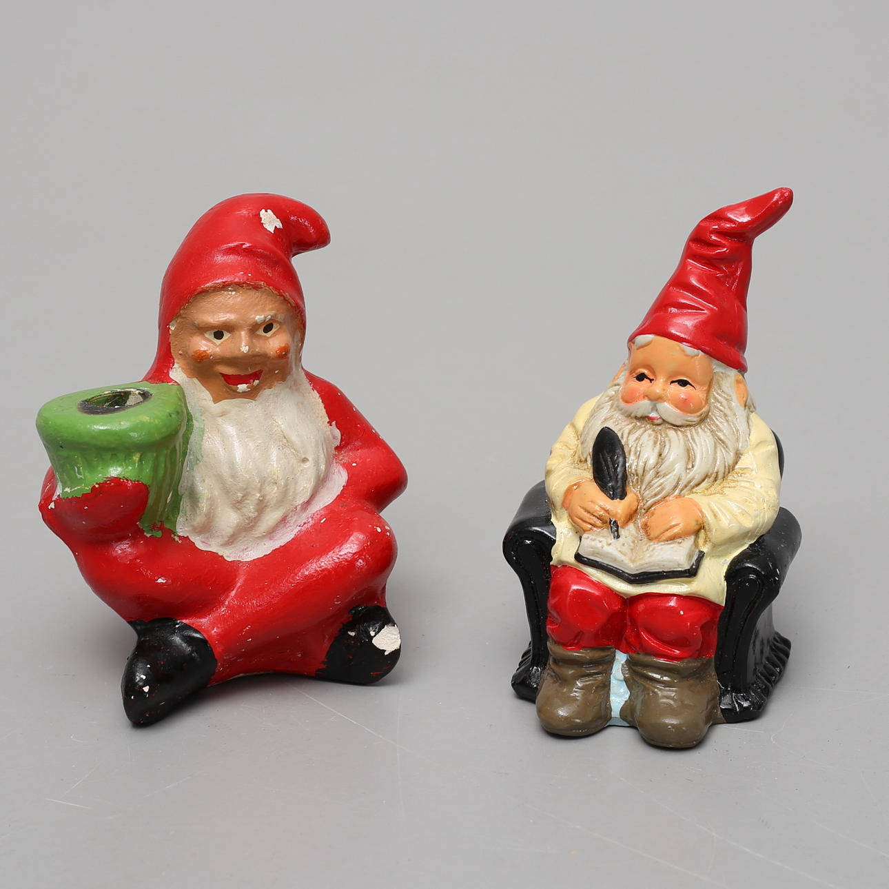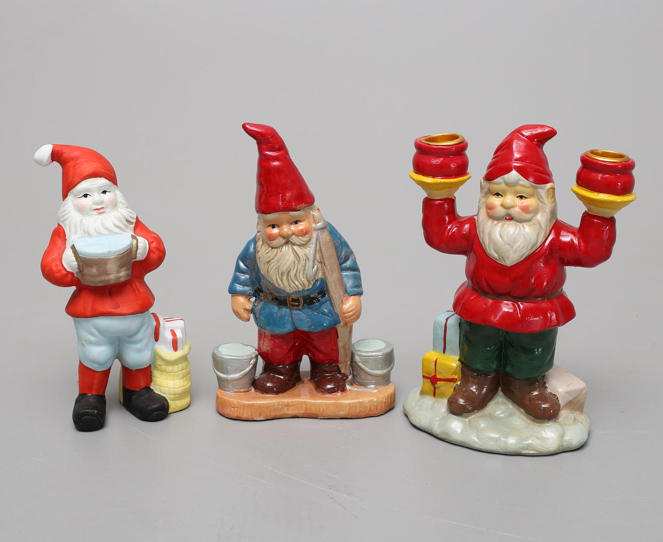 En ljusstake med brännmärke och stearinspill, del till största tomten saknas, ett par tomtar med färgskav.