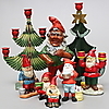 Fönsterprydnad i glas höjd 17 cm. 2 ljusstakar trä 37 och 40 cm. 6 tomtar 10,5 - 35 cm.