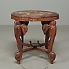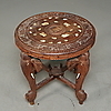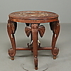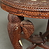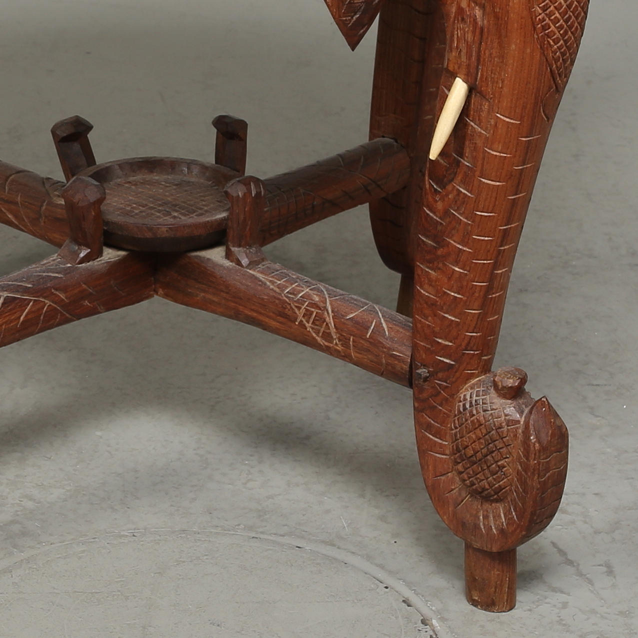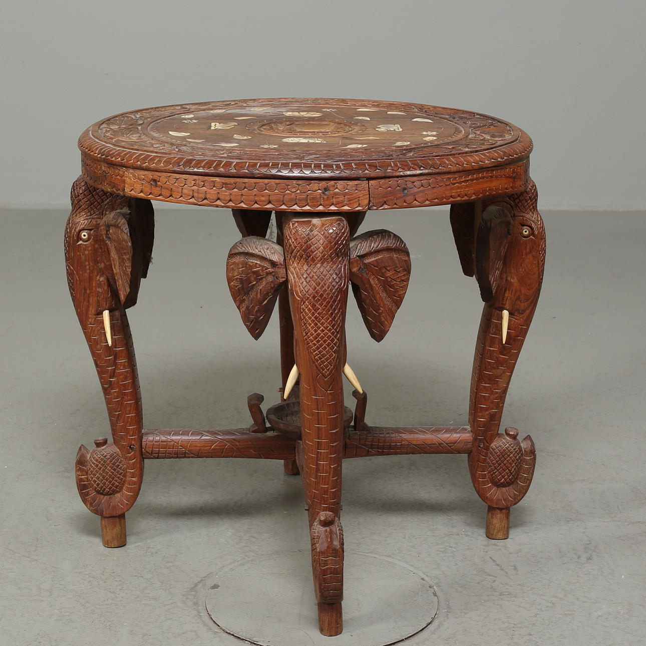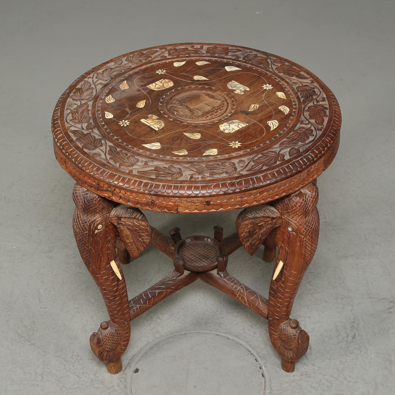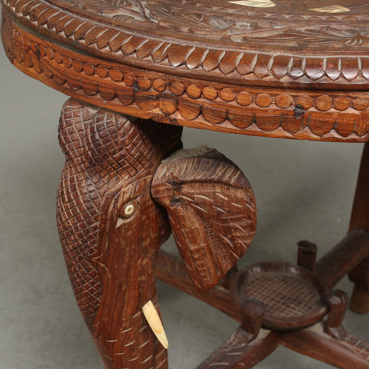 Rund skiva, trä med rikt skuren dekor och intarsiainläggningar av ben. Ben i form av elefanter. Höjd 61 cm Diameter 61 cm.