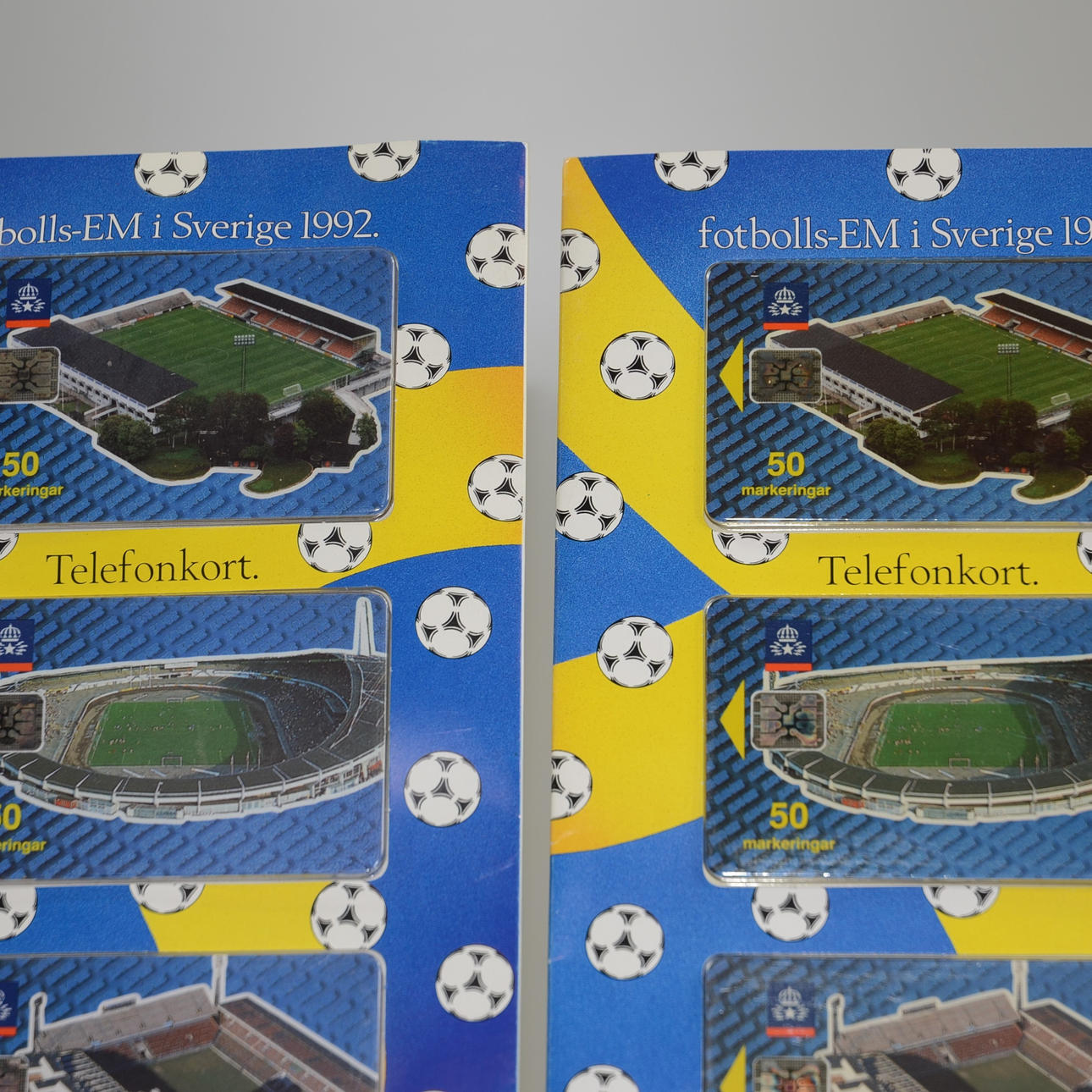 Två uppsättningar med telefonkort som gjordes till EM 1992 i Sverige. På korten visualiseras samtliga matcharenor.