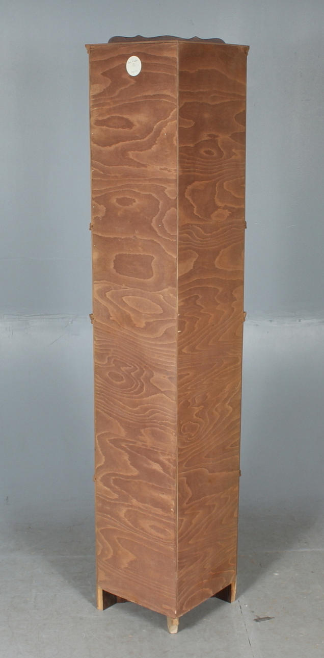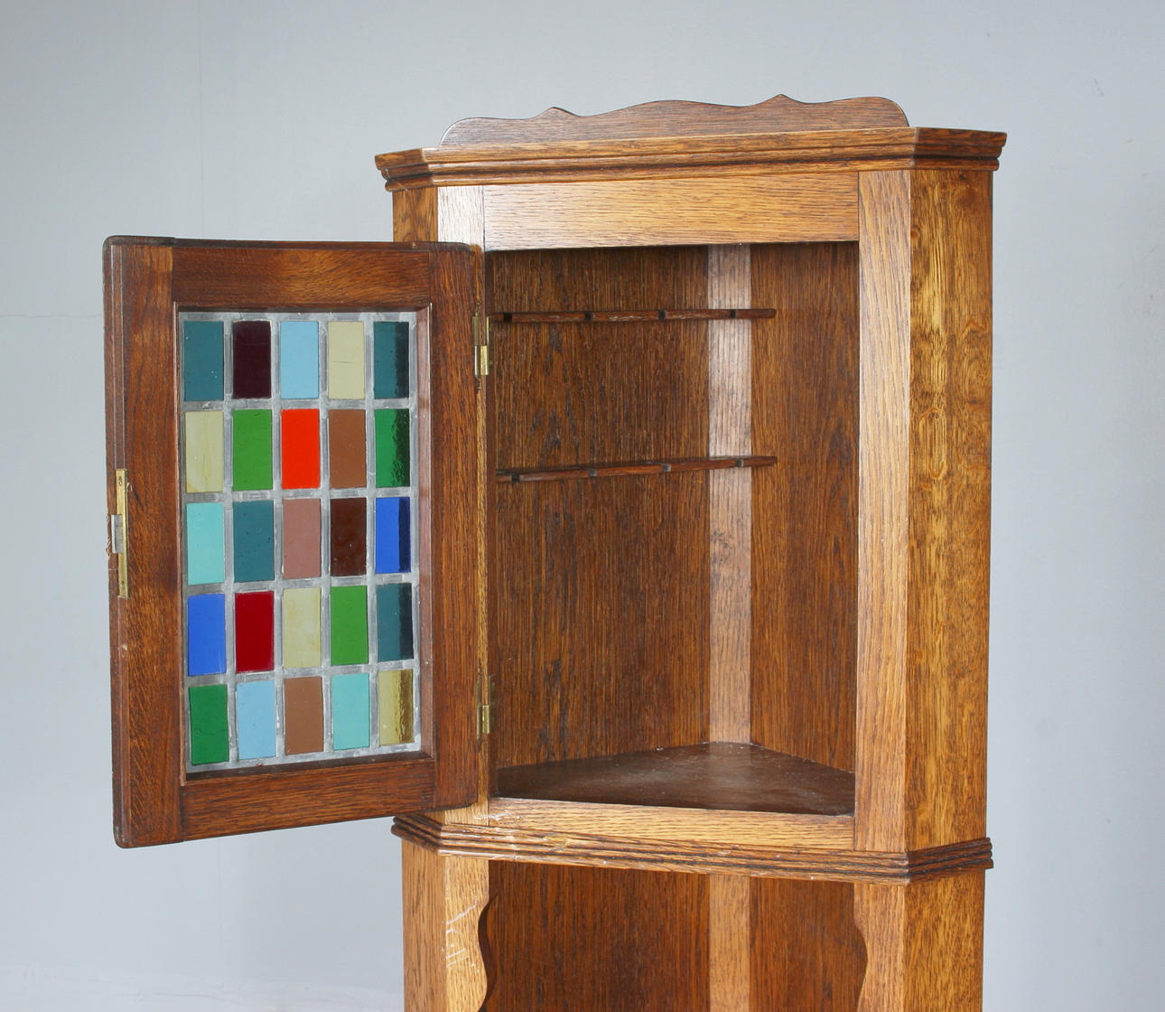 Litet nätt hörnskåp med blyinfattat färgat glas. Höjd 166, bredd 44 centimeter.