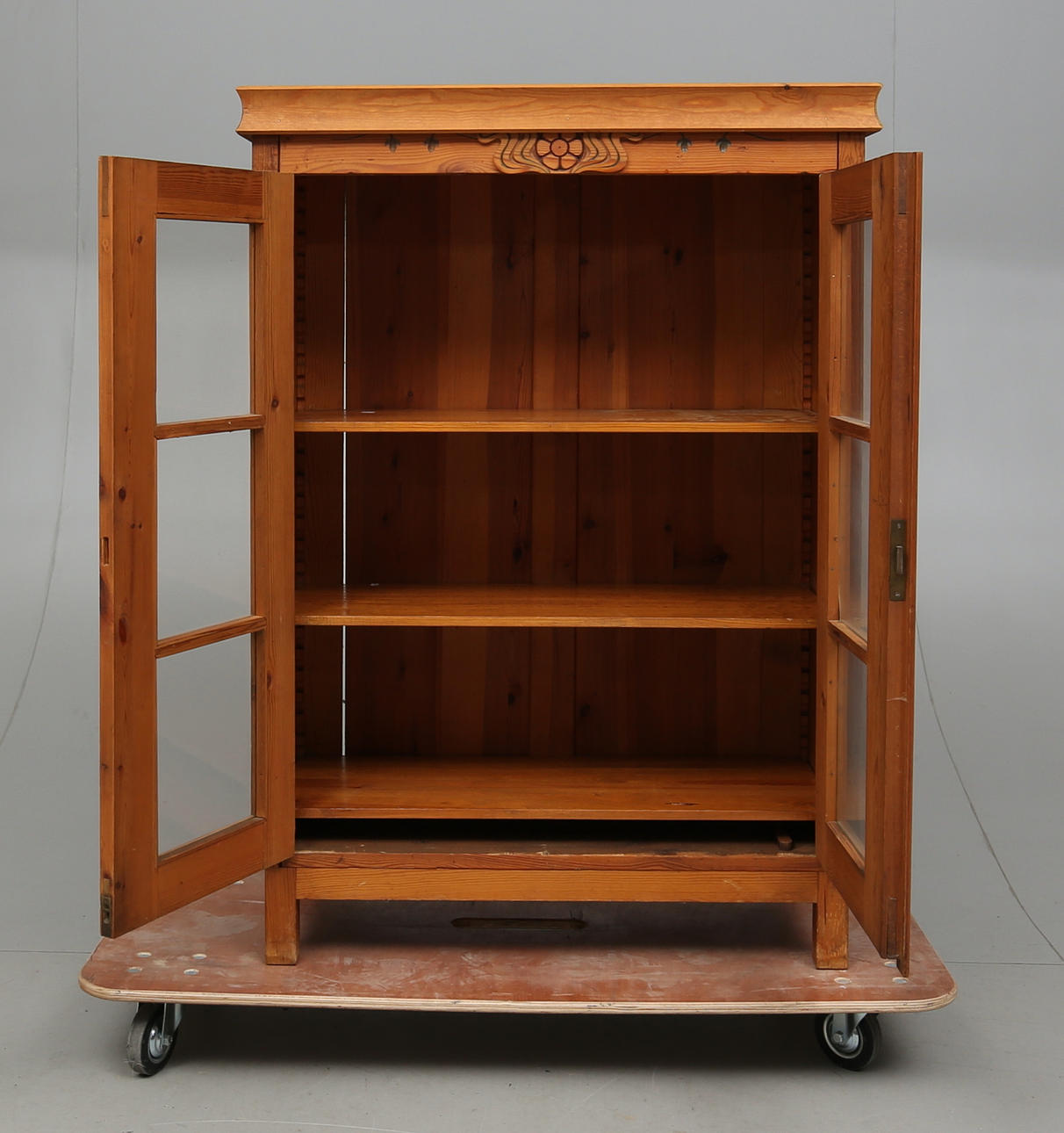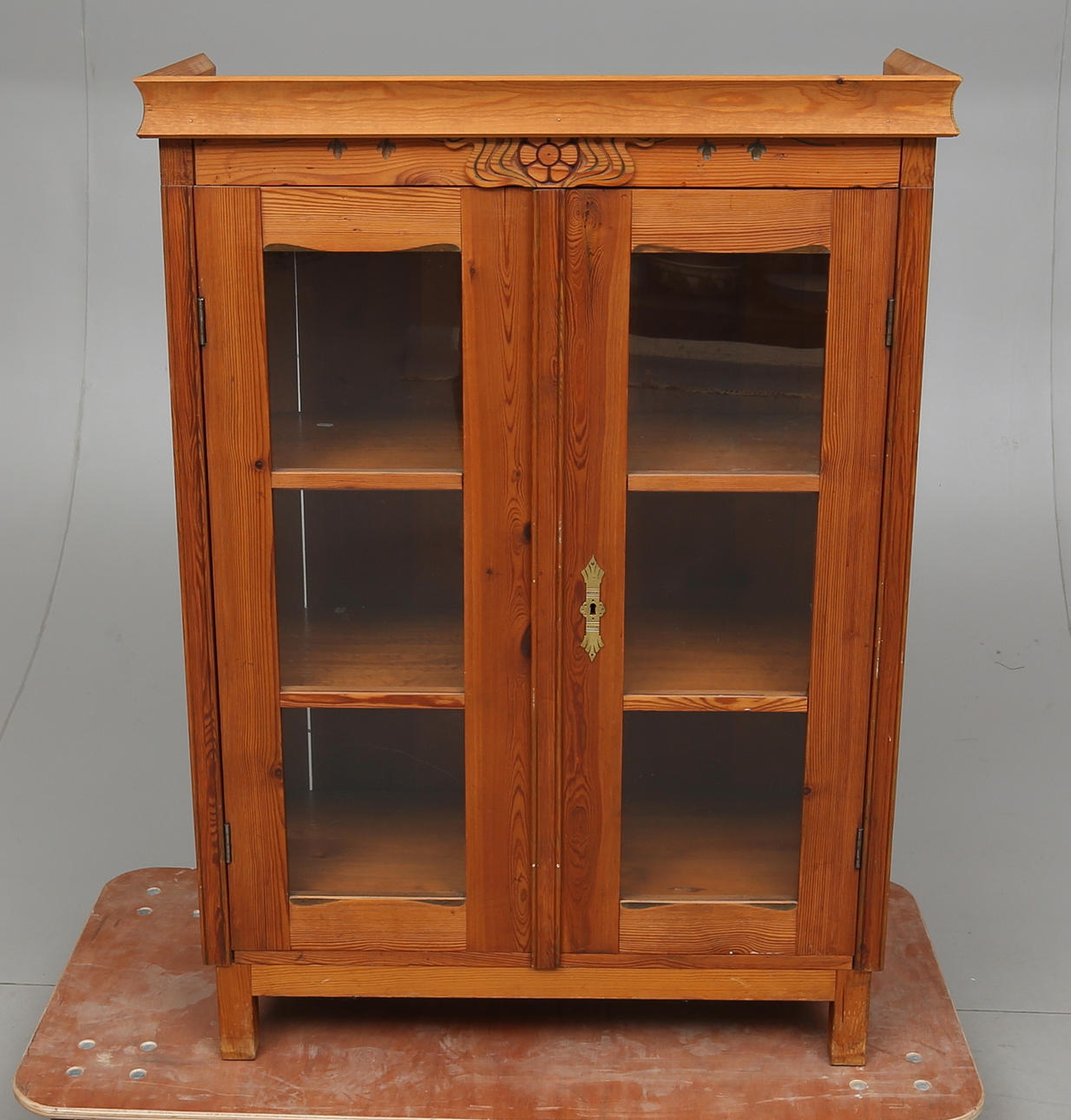 Furu. Ett glasat dörrpar med bakomliggande hyllplan. Längd 90. Bredd 39. Höjd 124 cm.