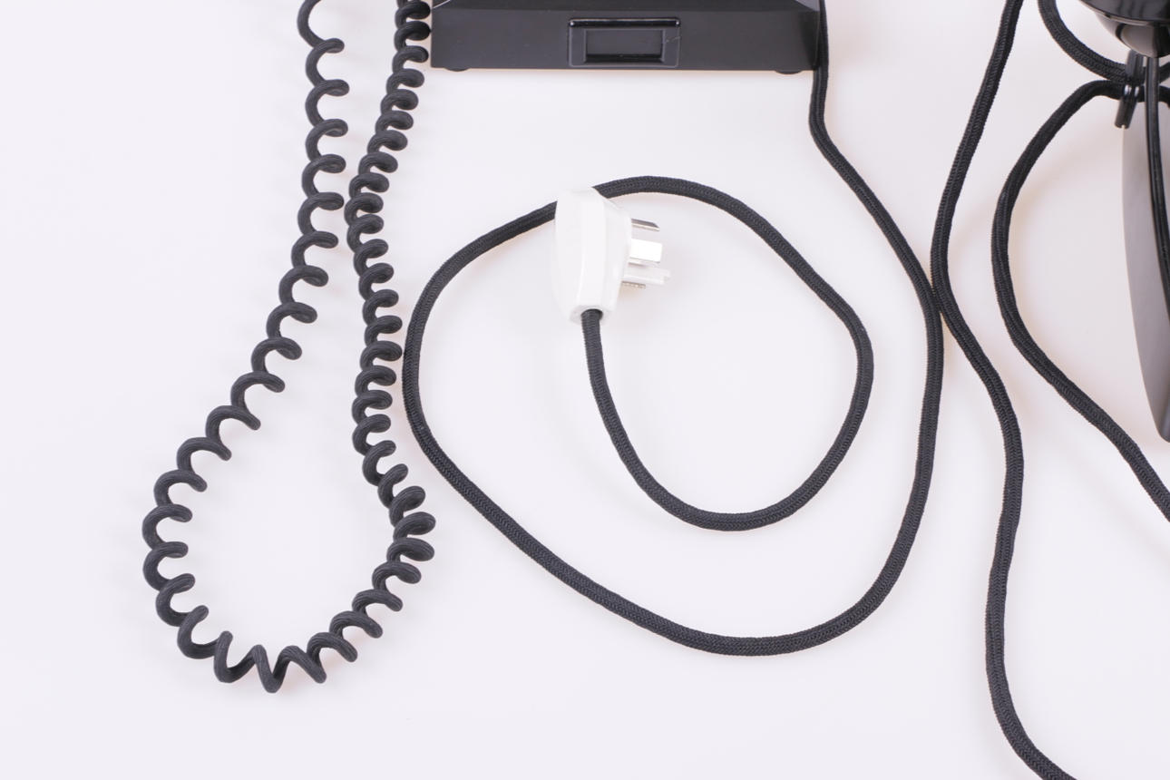 En telefon med slitage på tygöverdraget på sladden.