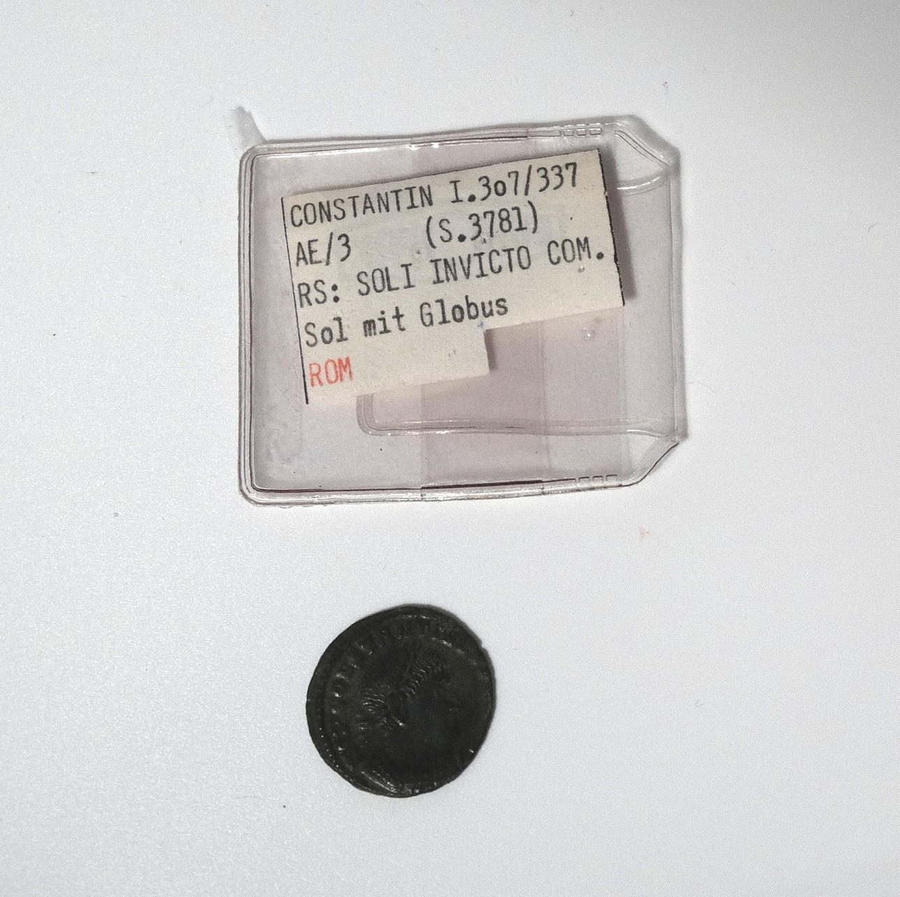 Forntida mynt från Konstantin I: s tid 307/337, Soli Invicto com. Sol med klot, Rom, diameter ca 1,9 cm.