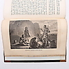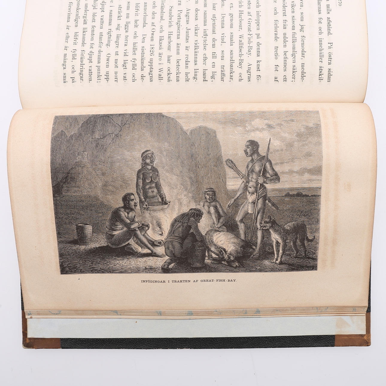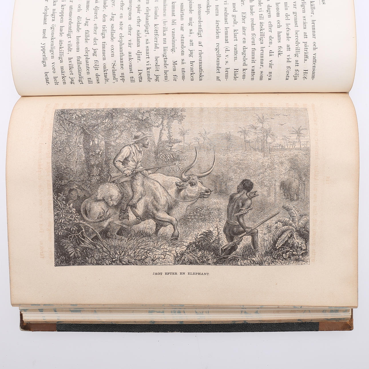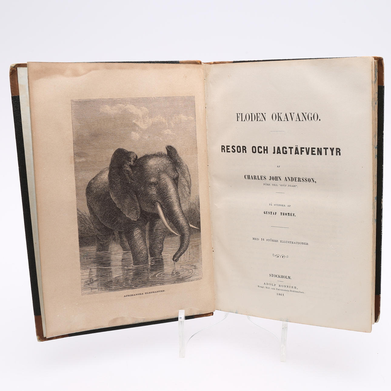 Andersson, Charles John. Floden Okavango. Resor och jagtäfventyr. På svenska af Gustaf Thomée. Med 16 större illustrationer. Adolf Bonnier, Stockholm, 1861. Stor 8vo i ett nära samtida halvfranskt band. Exlibris. Originalets titel: The Okavango River, a Narrative of Travel, Exploration and Adventure. London, 1861. XII, 312 sid. + 16 helsides planscher. Carl Johan (Charles) Andersson, född 4 mars 1827 i Norra Råda socken, Värmland, död 5 juli 1867 i Ovamboland i nuvarande Namibia, var en svensk-engelsk afrikaresenär och naturforskare. Andersson var son till den engelske björnjägaren Llewellyn Lloyd.