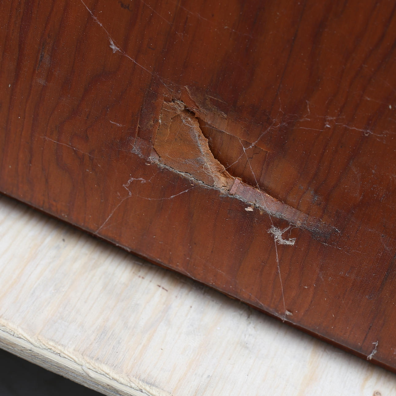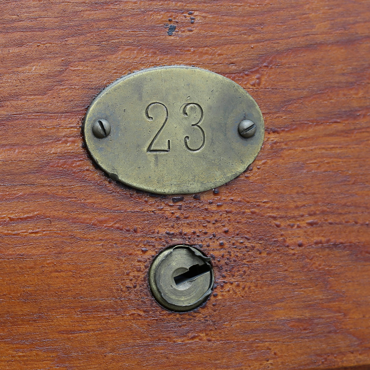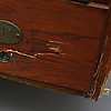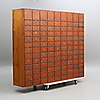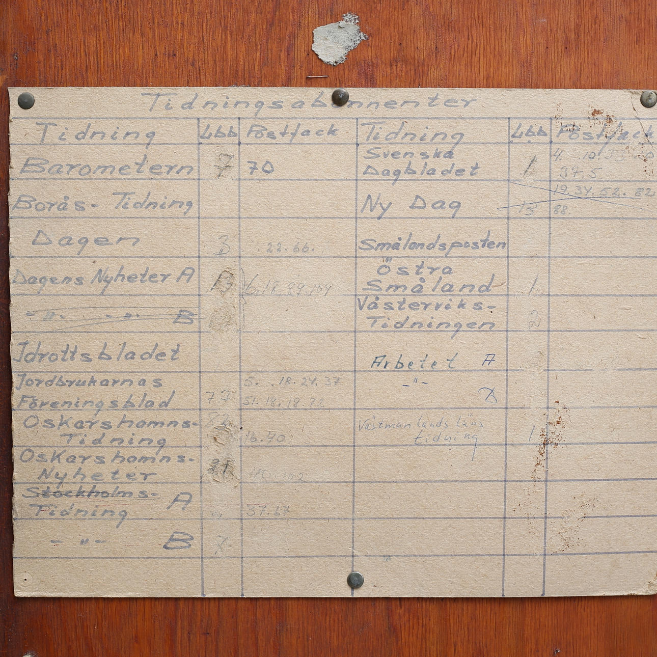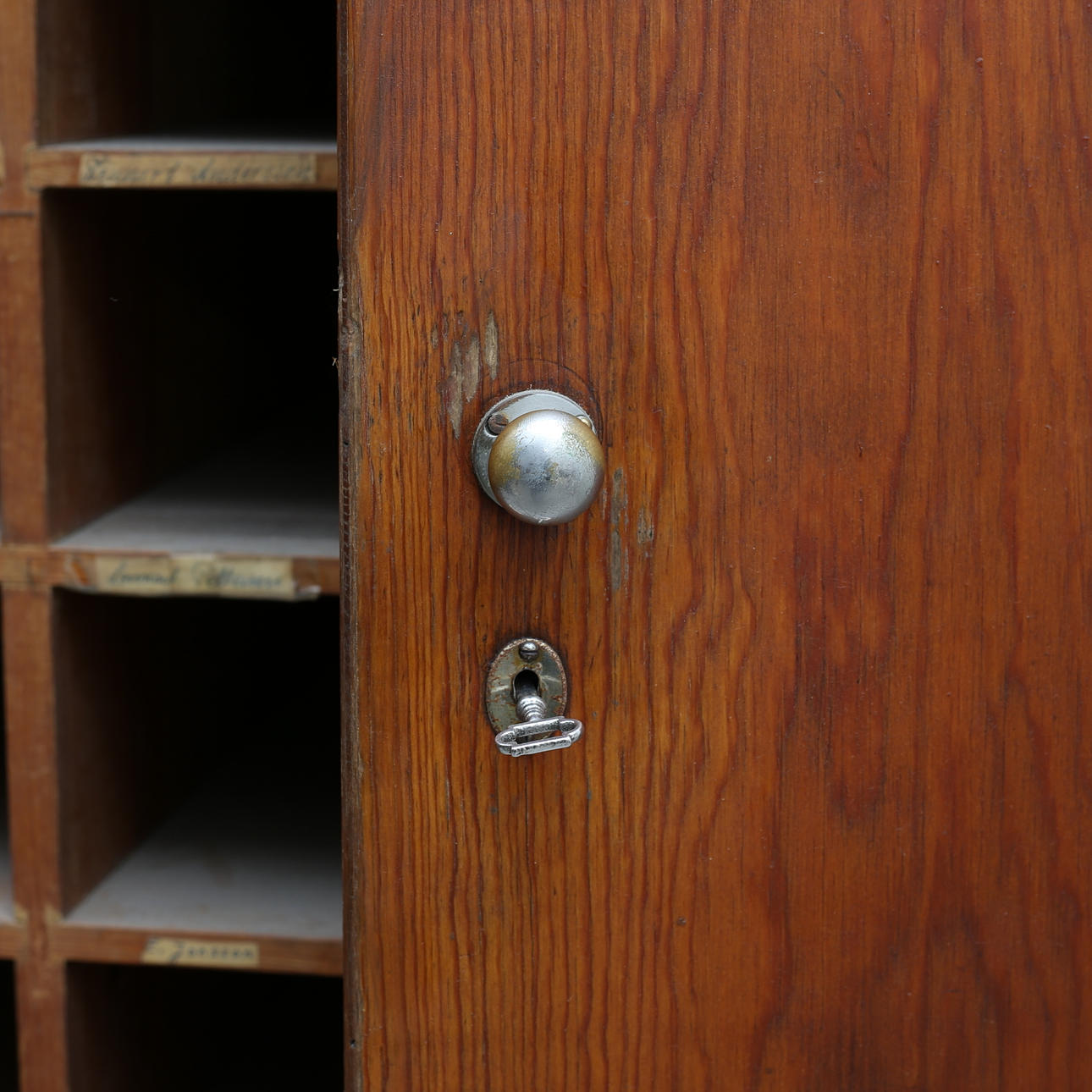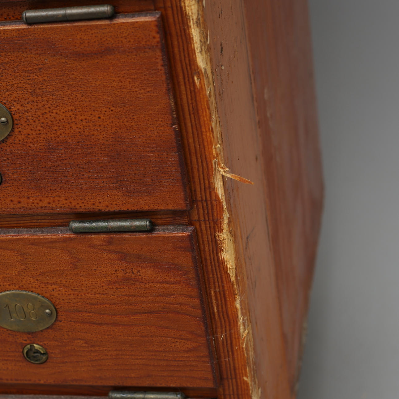 Nycklar till postfack sakans. Märken, fläckar, fanerskador. Skada på höger sida, samt skada på lådan längst ner på höger sida.