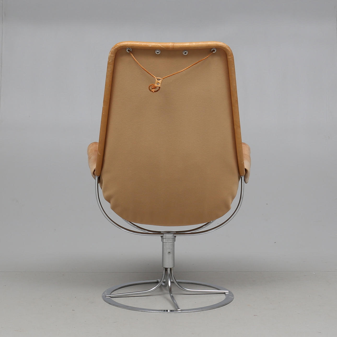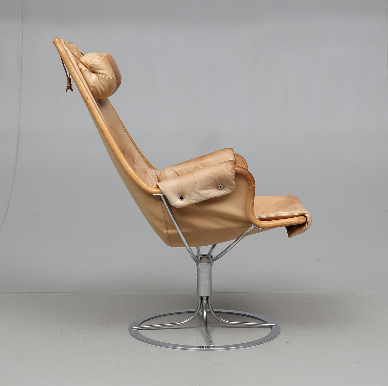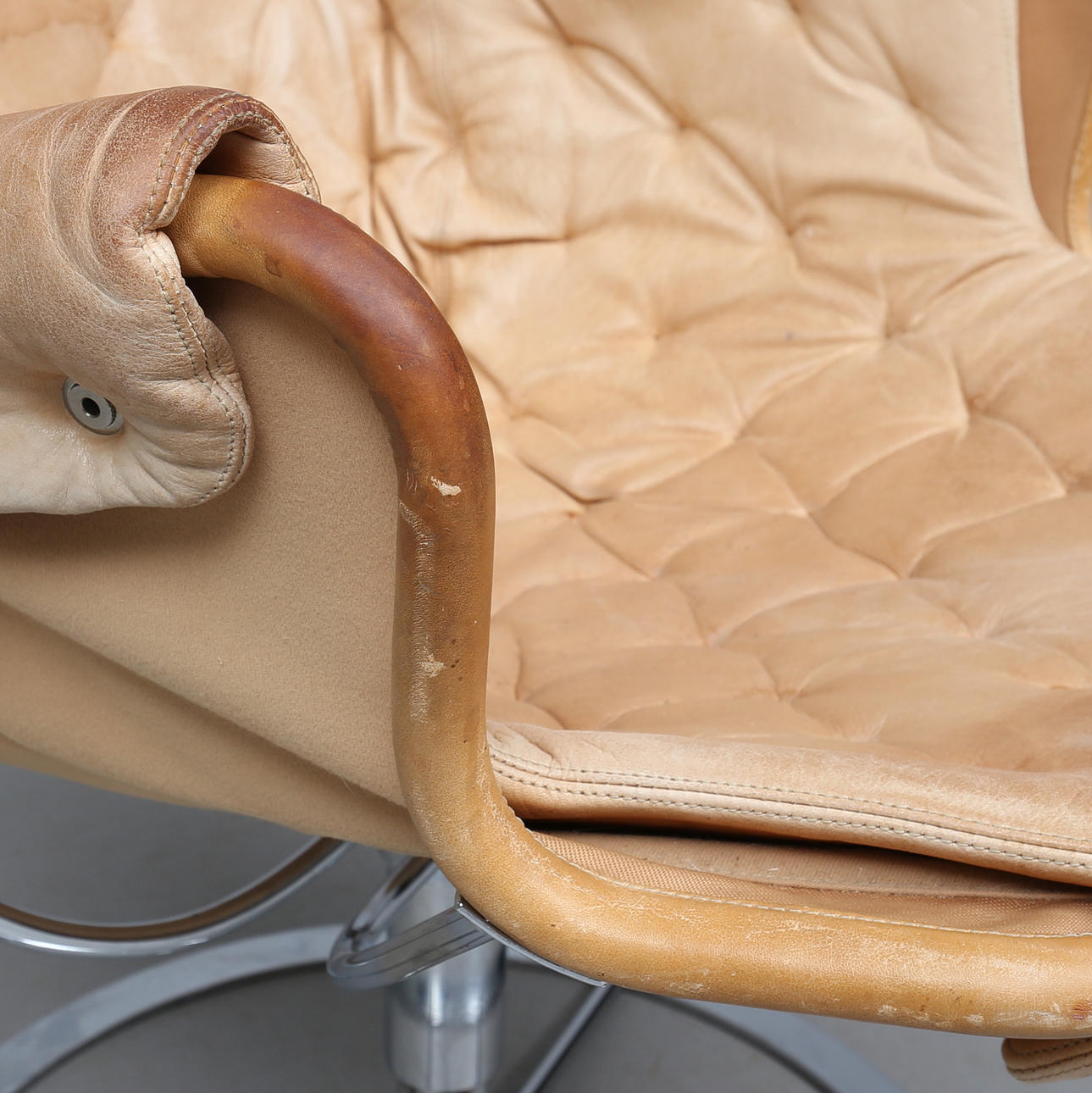 Benställning av kromad metall. Klädsel av skinn. Lös nackkudde.