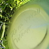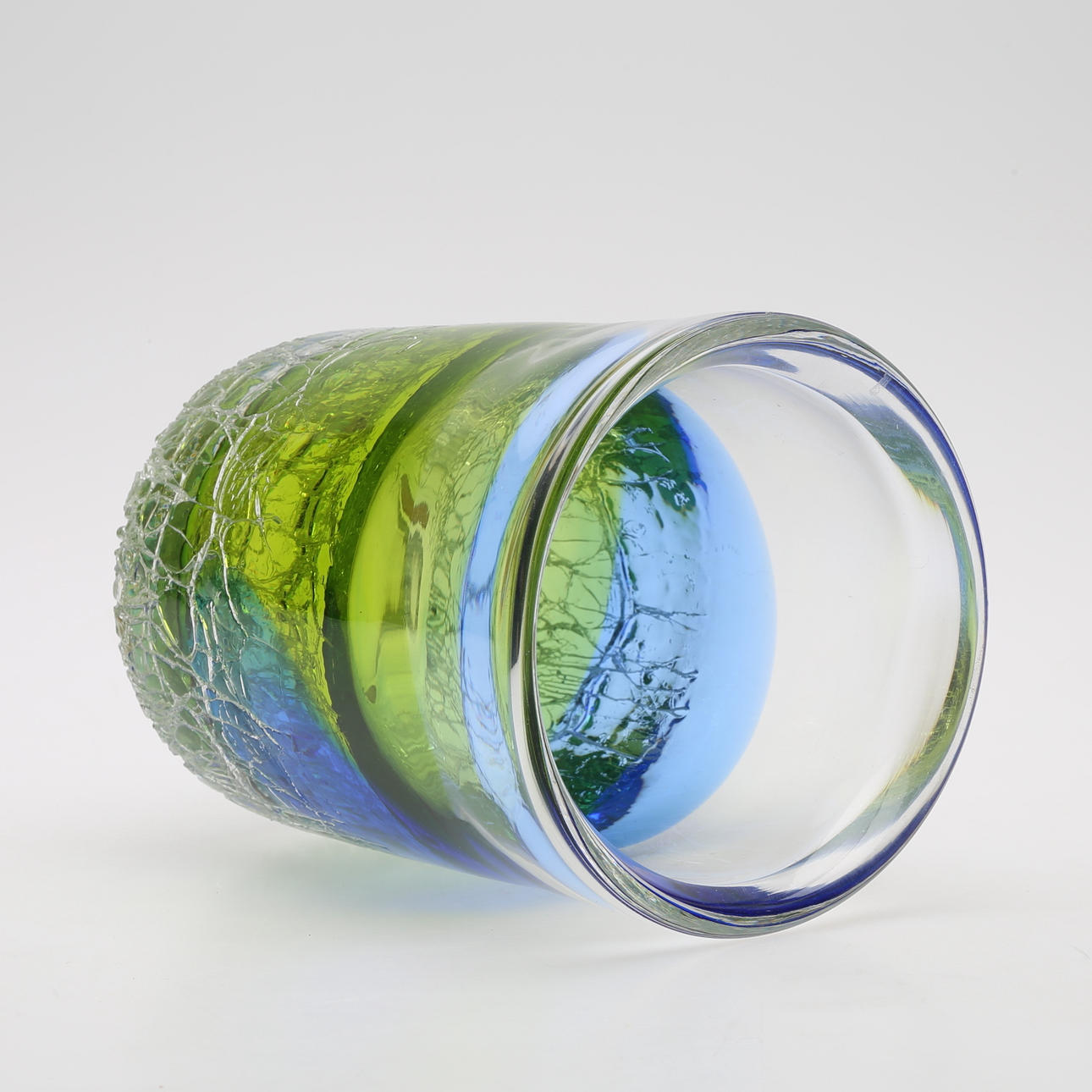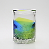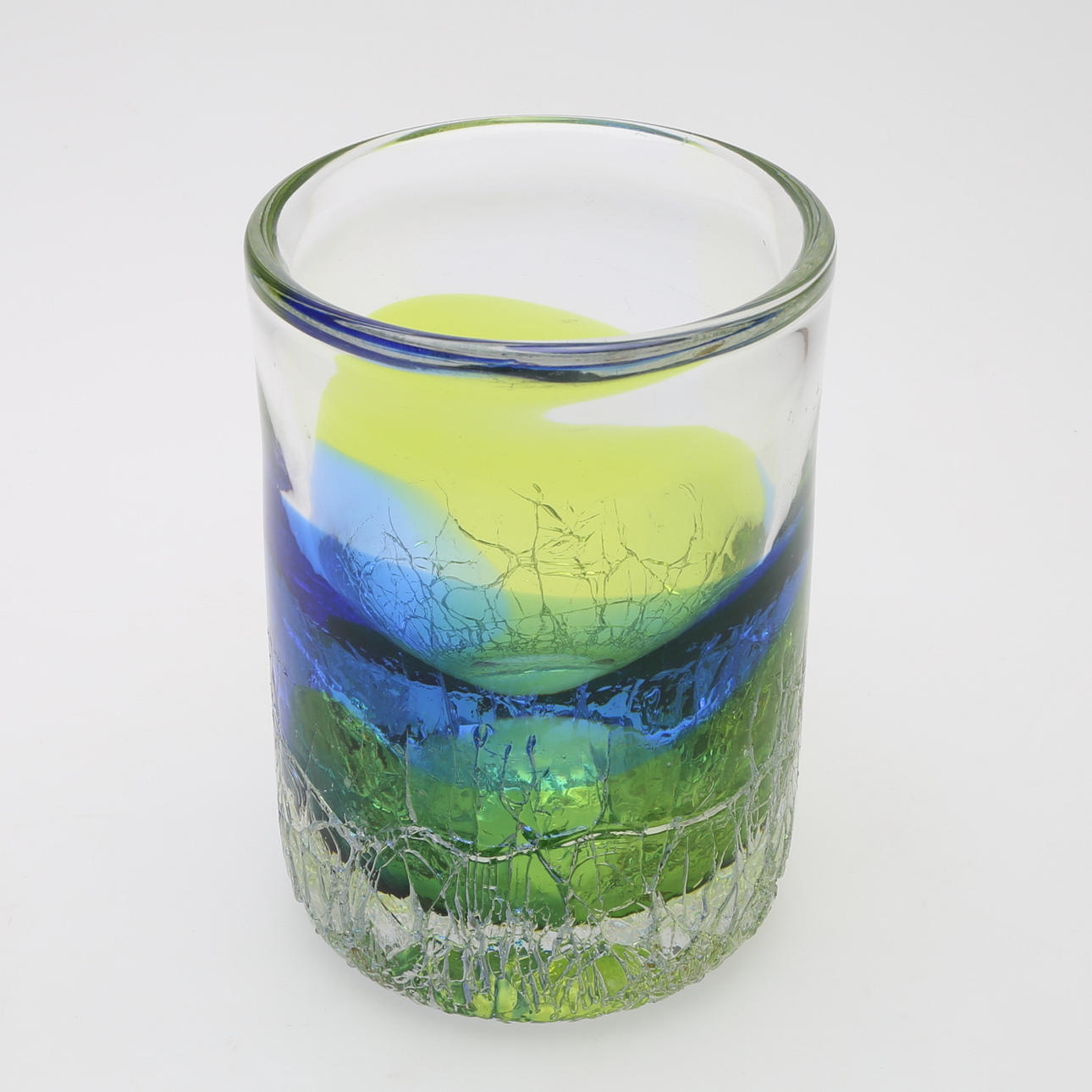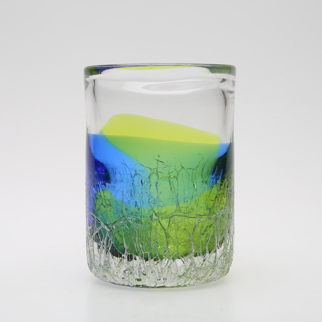 Vas i klar glasmassa med dekor i blått och grönt, oregelbunden yta.