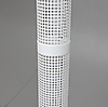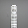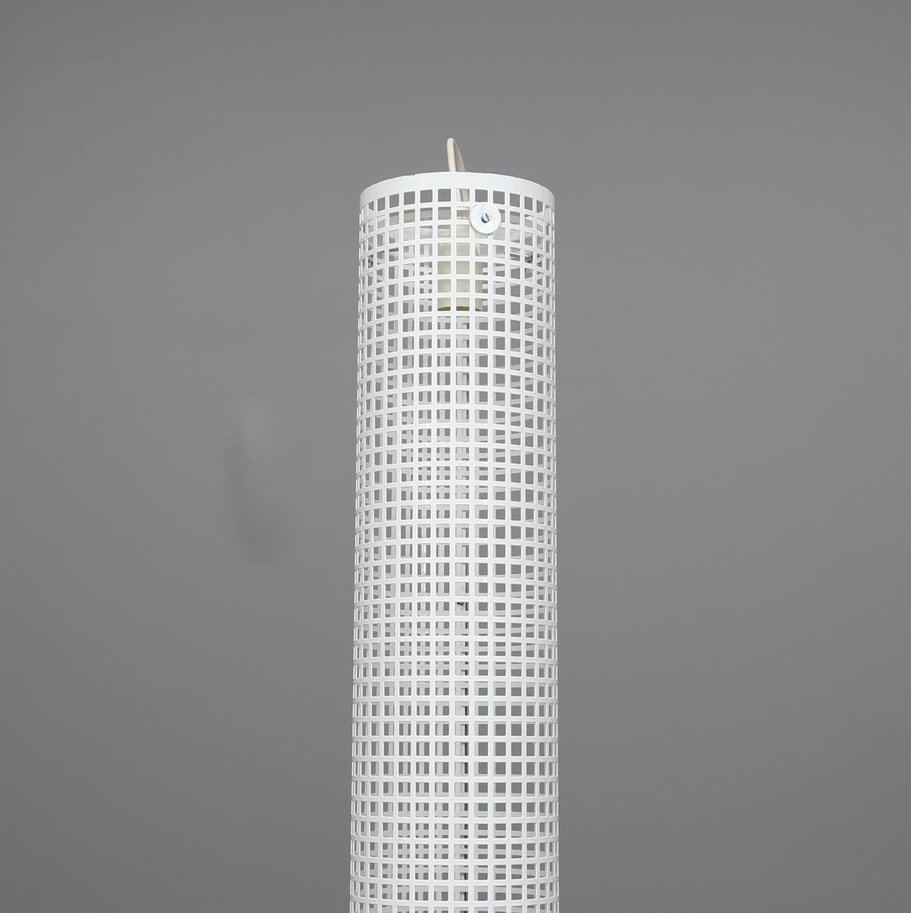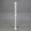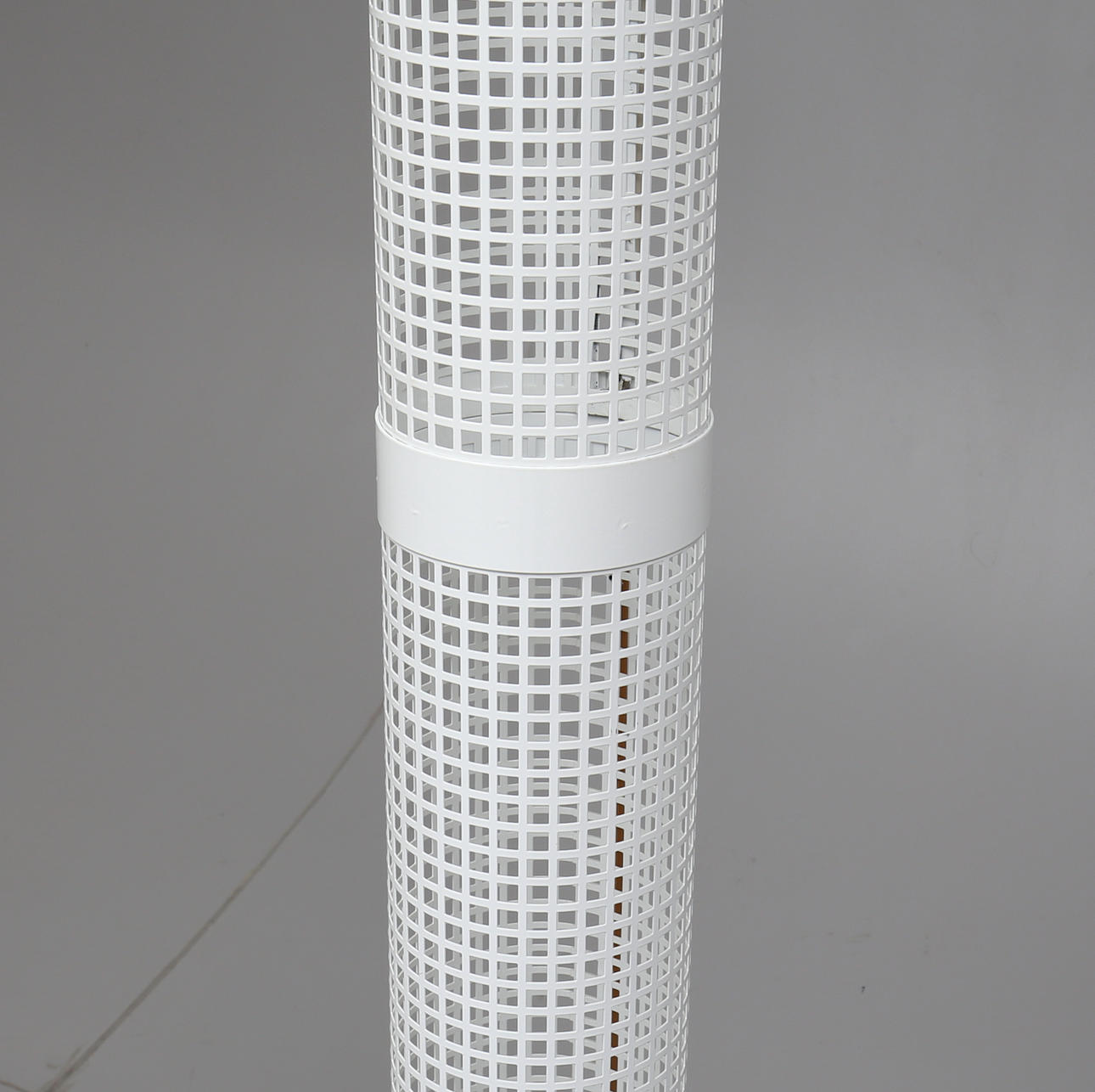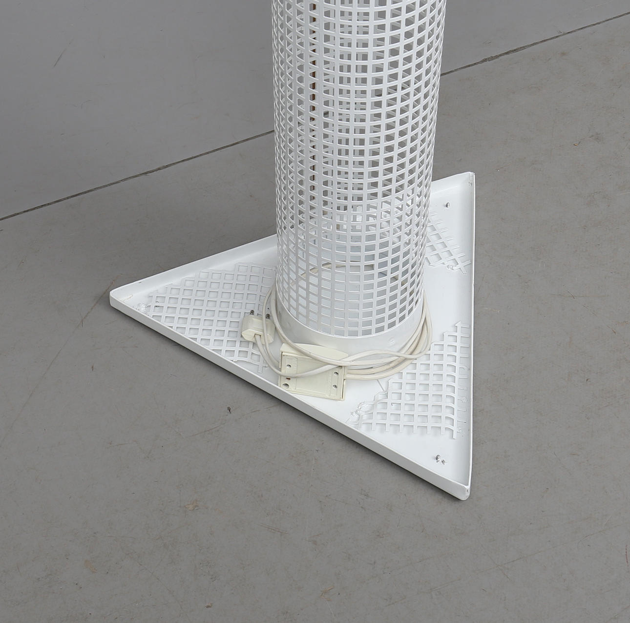 Delbar. Lackerad metall och metallgaller. Cylindrisk på triangulär fot. En ljuspunkt. Höjd ca 205 cm.