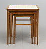 Alm. Tre bord med kaklad skiva i vitt, rött och blått. Största bordet mått. Längd 45, bredd 34, höjd 52 cm.