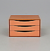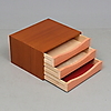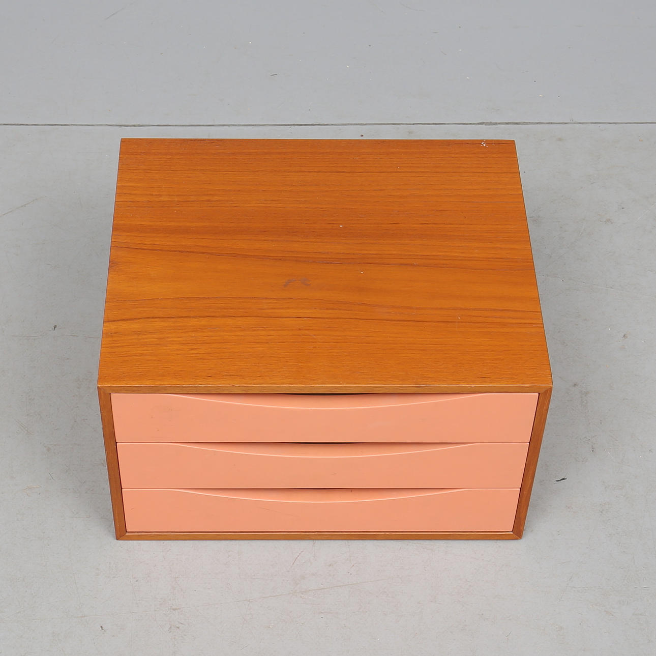 Stomme teak. Tre lådor med målad front. Längd 42. bredd 35. Höjd 24 cm.