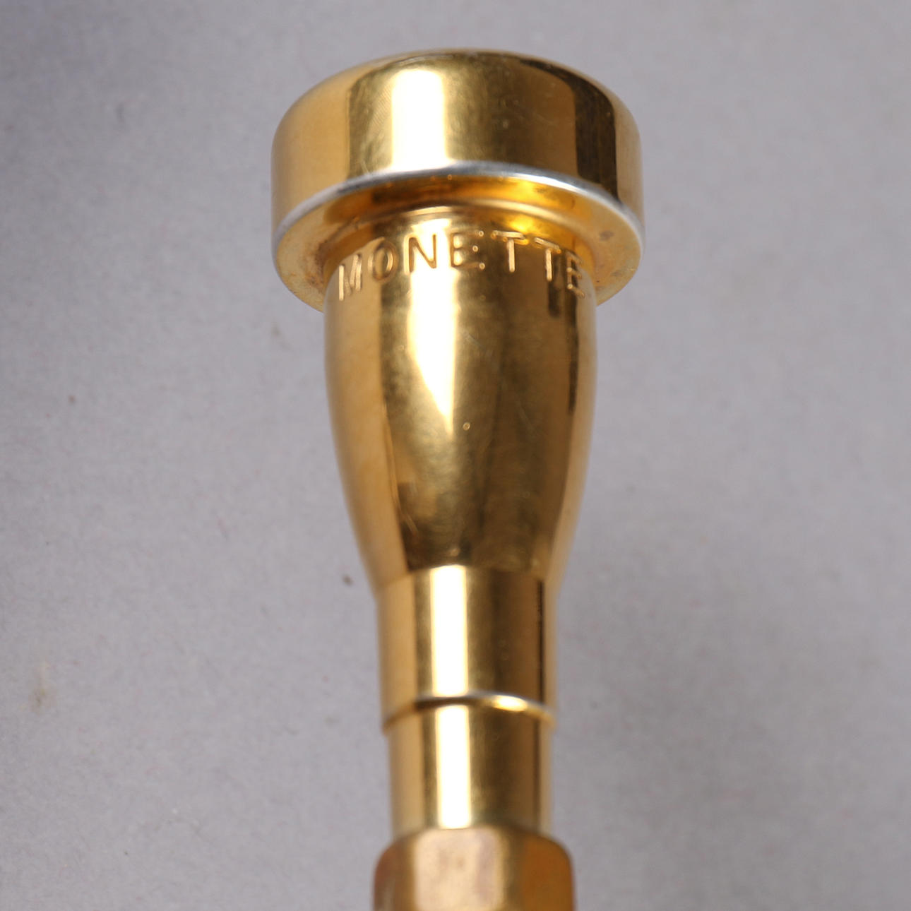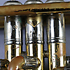 Mässingsklockstycke, ventilknappar med pärlemor. Märkt Elkhart, Ind. U.S.A. Märkt ML 44150 på ventil. Längd utan munstycke 50 cm. Munstycket märkt Monette B3.