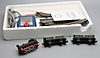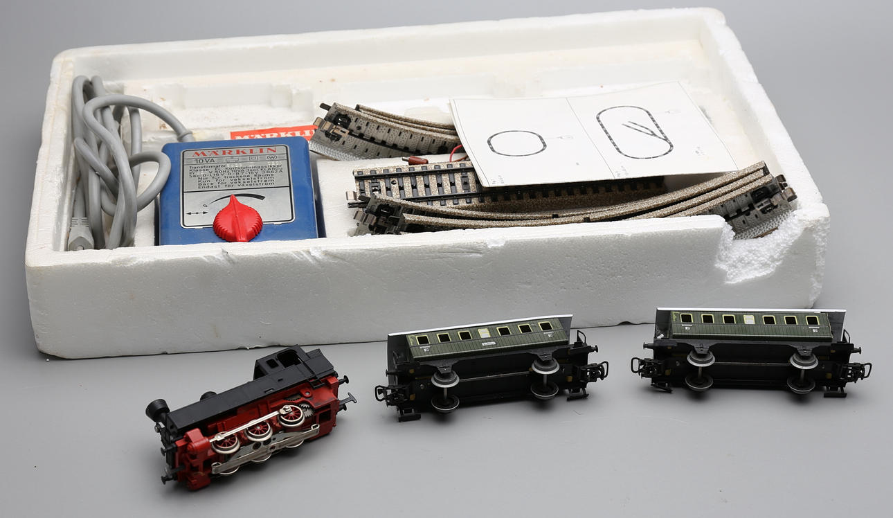 Ett lok, fem vagnar, räls, hus, träd, bilar.