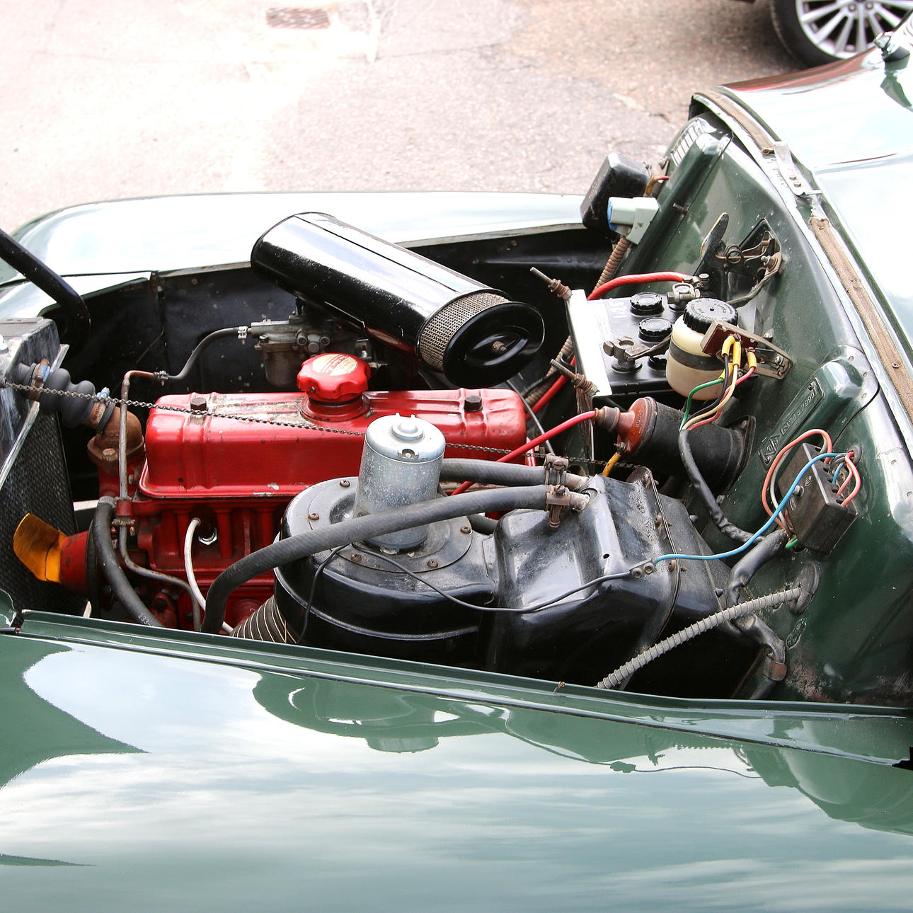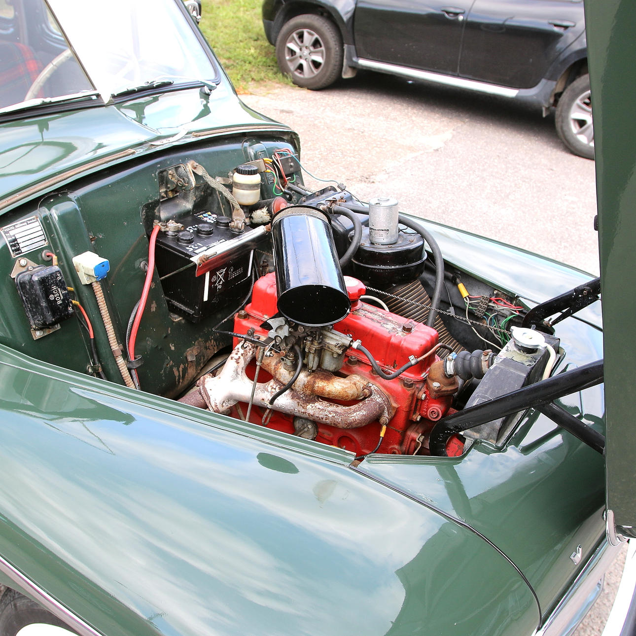 Bruks och åldersrelaterad slitage. Mindre bubblor i lacken på höger dörr och motorhuv. Renoverad, lackad och återställd för ca 15 år sedan.