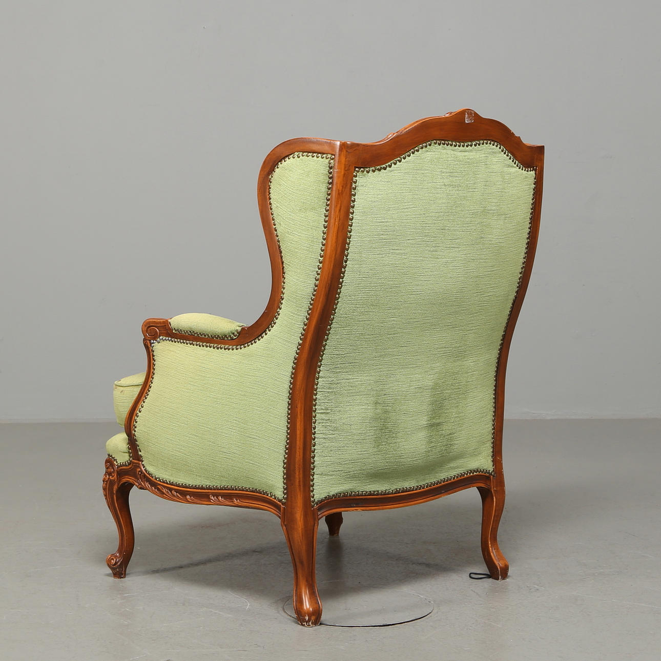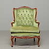 Träskuren dekor, plyschklädsel, häftad i ryggen, öronlappsmodell, lös sittplymå, höjd 102 cm, längd 70 cm, bredd ca 80 cm.