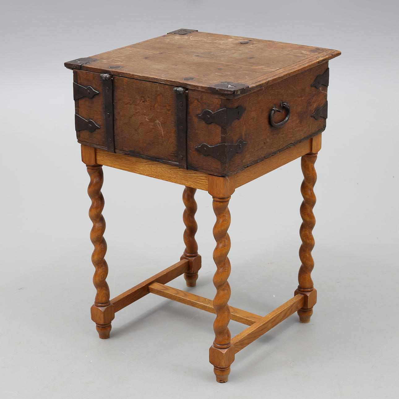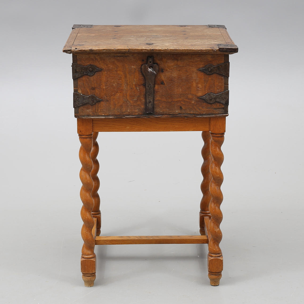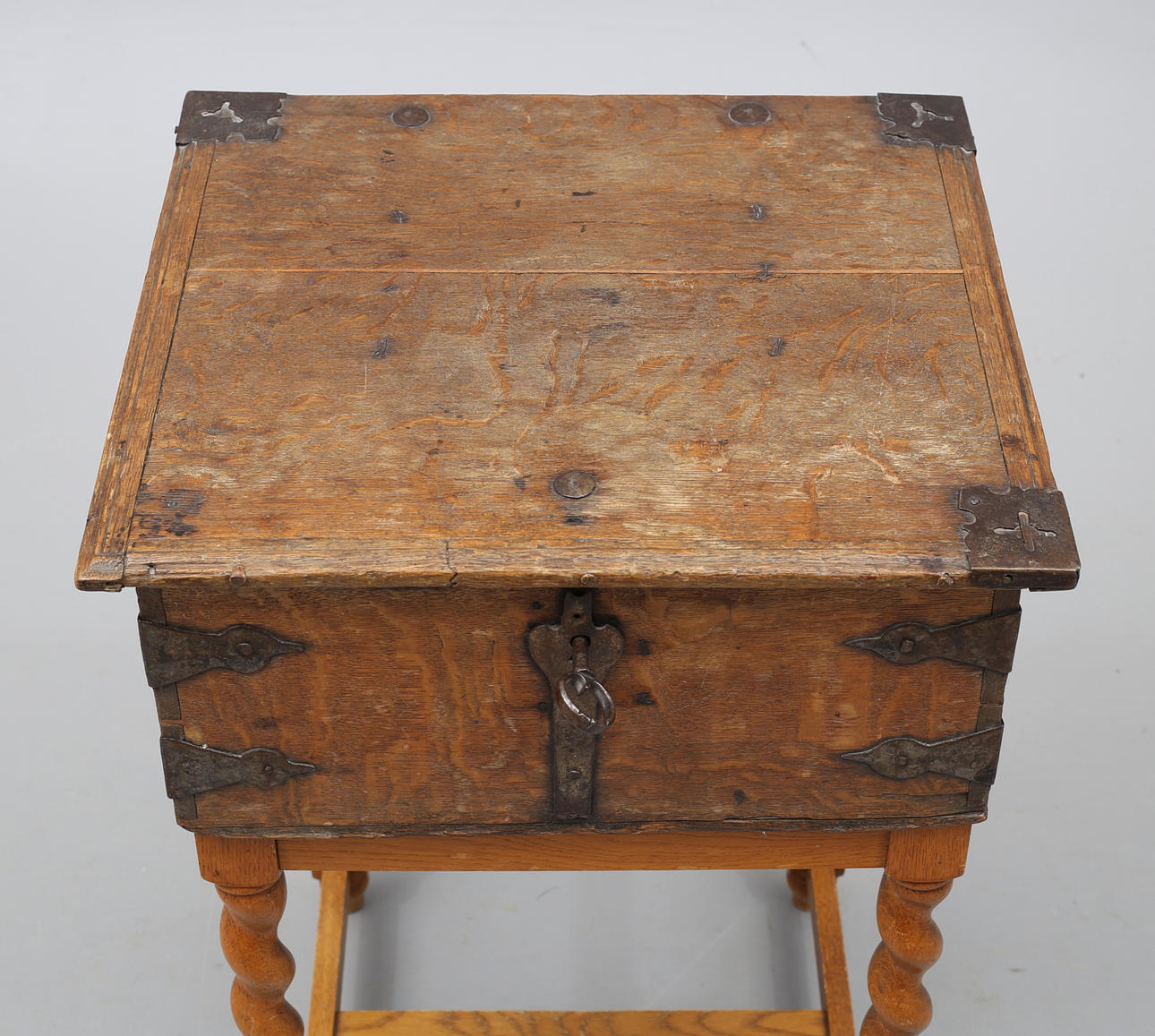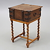 Snäpplås. Skrin höjd 19, bredd 46, djup 43 cm på senare benställning totalhöjd 70 cm.