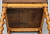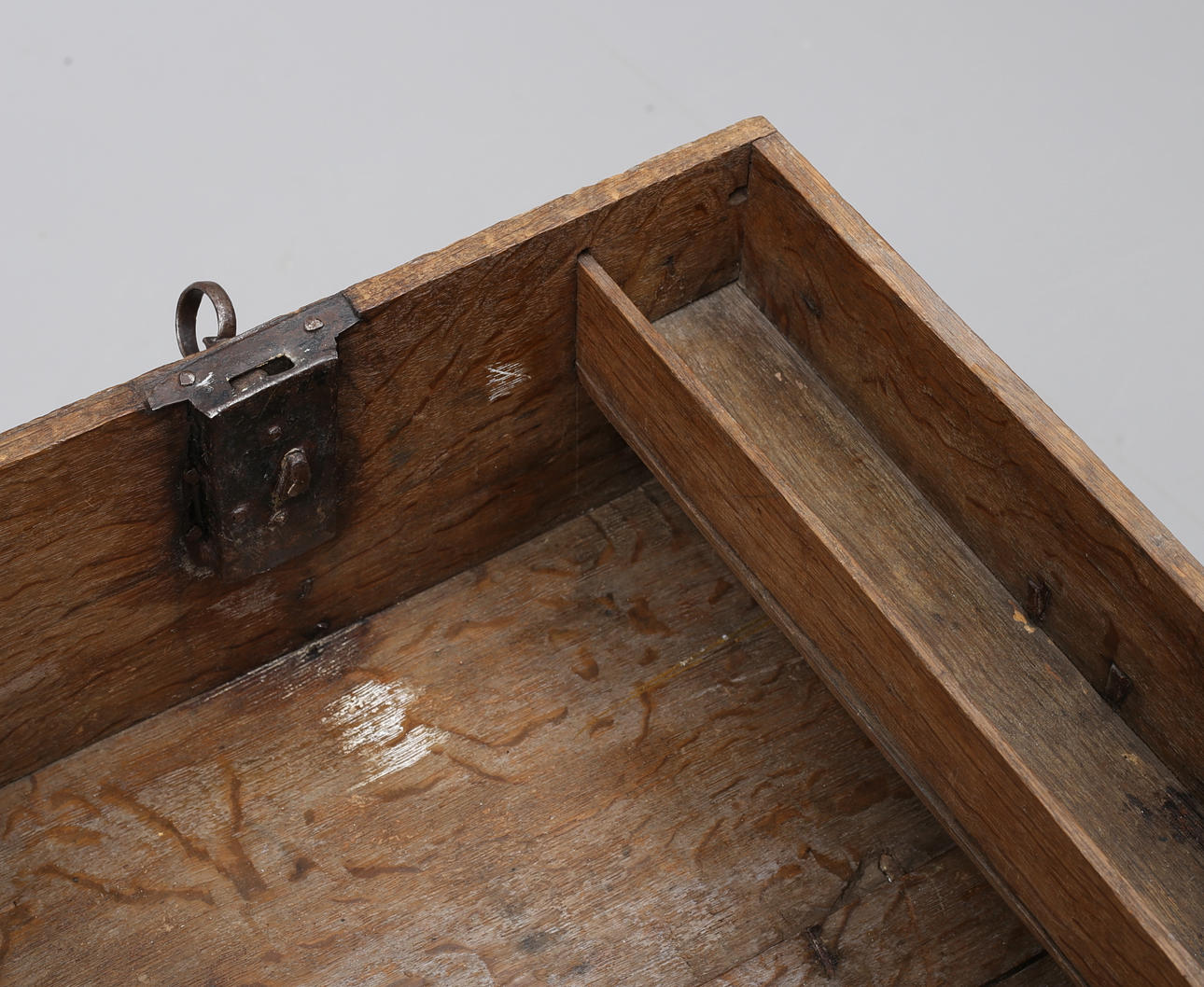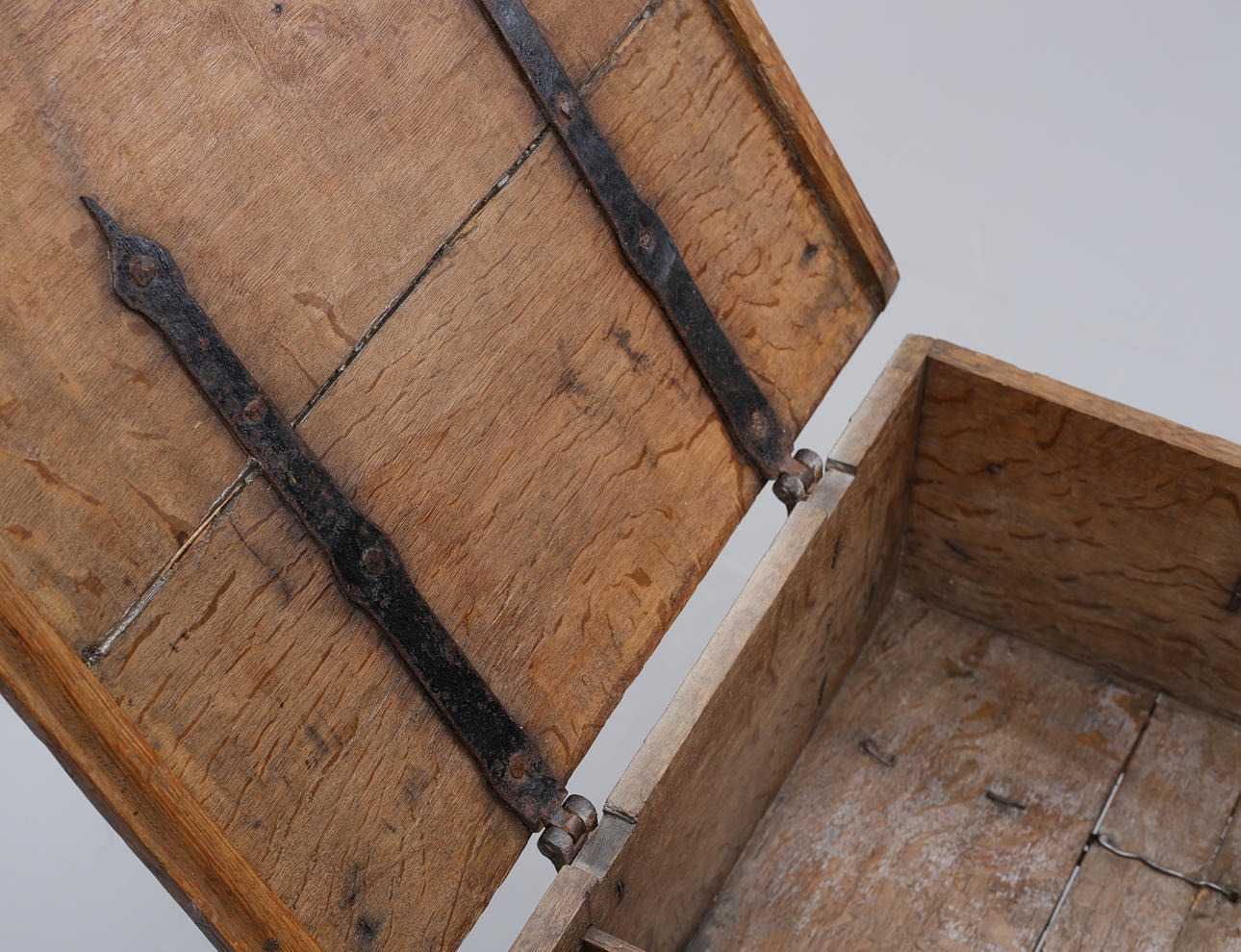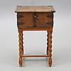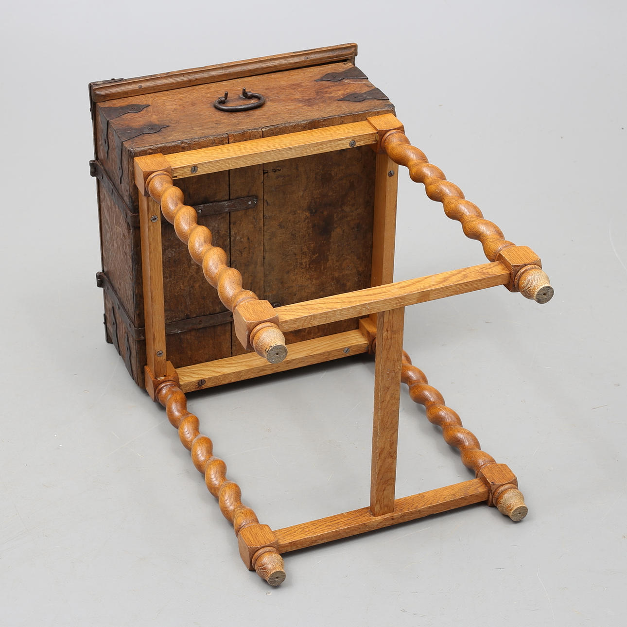 Snäpplås. Skrin höjd 19, bredd 46, djup 43 cm på senare benställning totalhöjd 70 cm.