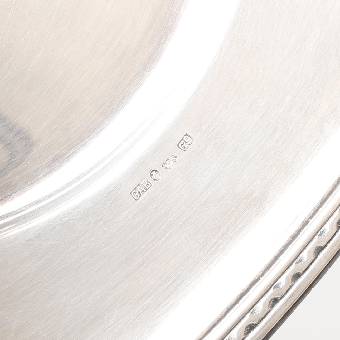 Fat i silver från GAB. Längd 27,5 cm, bredd 27,5 cm. Med inskription. Stämplat GAB, Stockholms stadsstämpel, kattfot, S och G9 (år 1957).