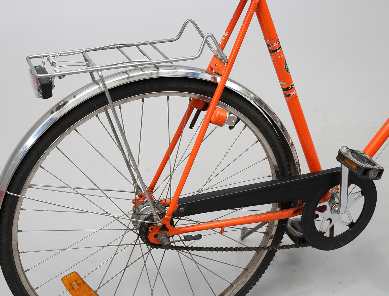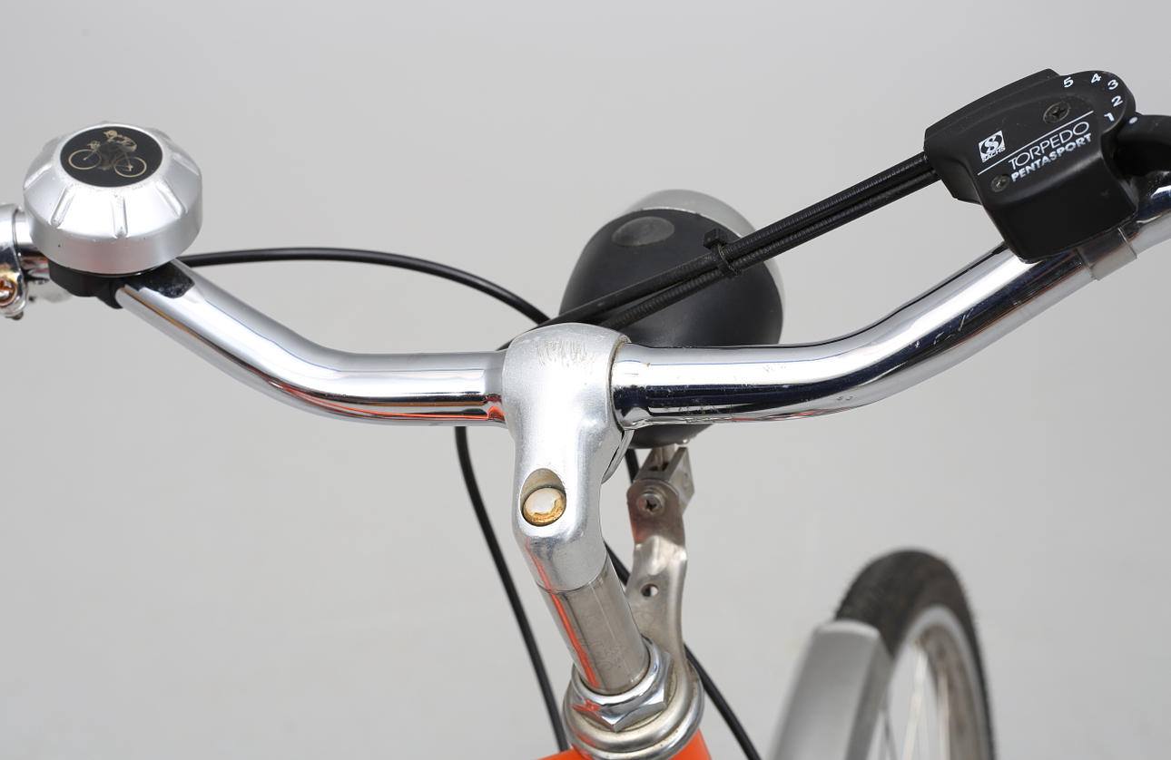 Brandgul. Brooks-sadel. Torpedo 5-växlad. Med lås och nyckel.