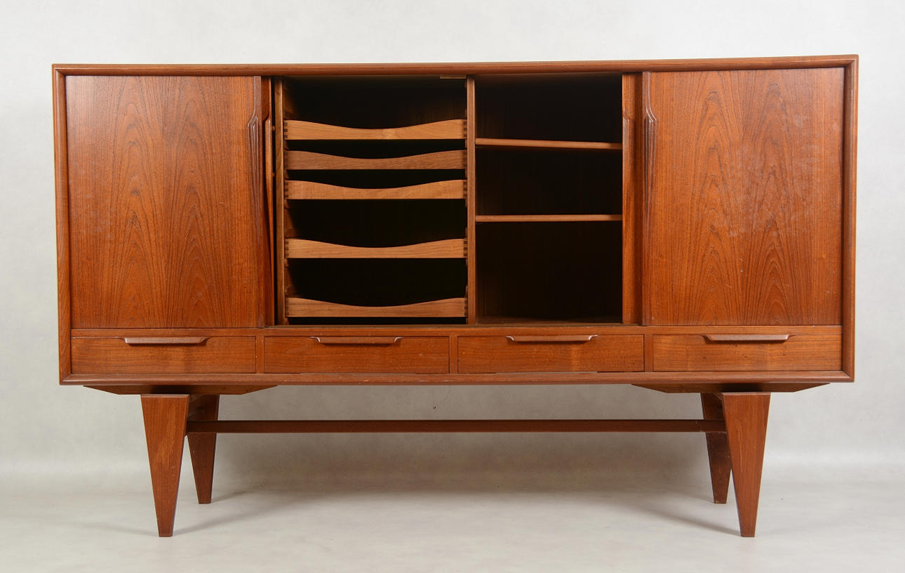 Invändigt inredd med hyllplan samt bestickförvaring, skjutdörrar samt 4 st lådor, bredd 200 cm, djup 48 cm, höjd 120 cm.