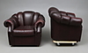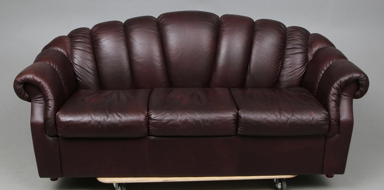 Soffa + 2 fåtöljer vinrött läder. Lösa sitsplymåer. Längd 200 bredd 90, höjd 90,cm. Fåtöljernas längd c:a 100 cm.